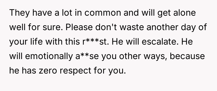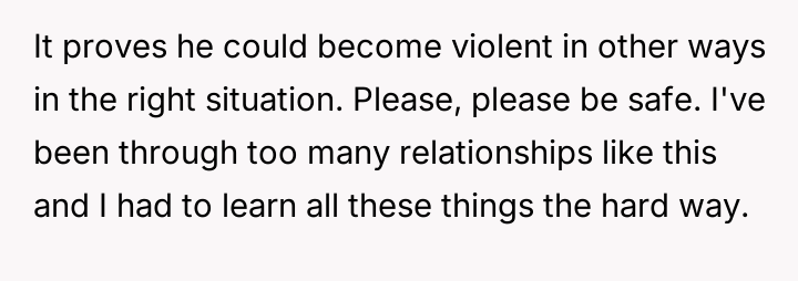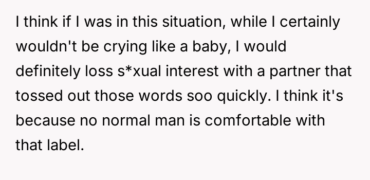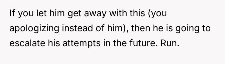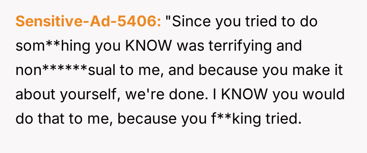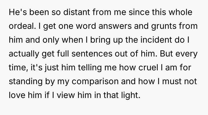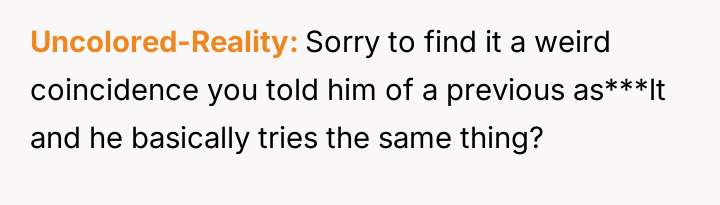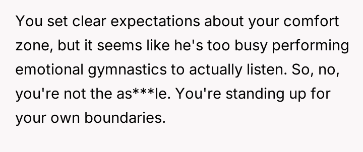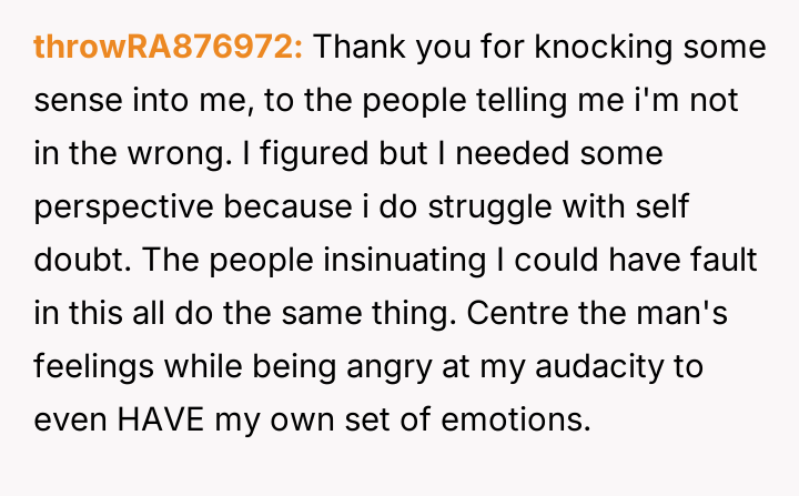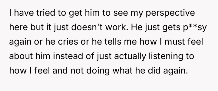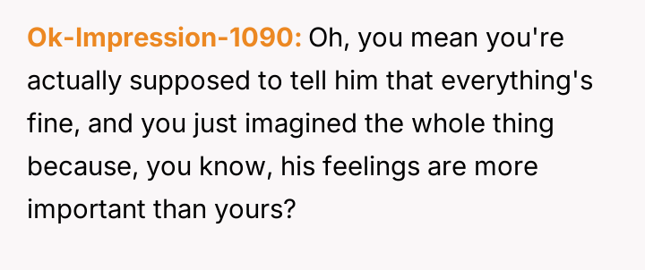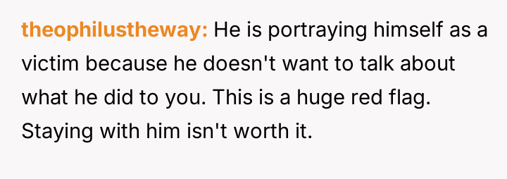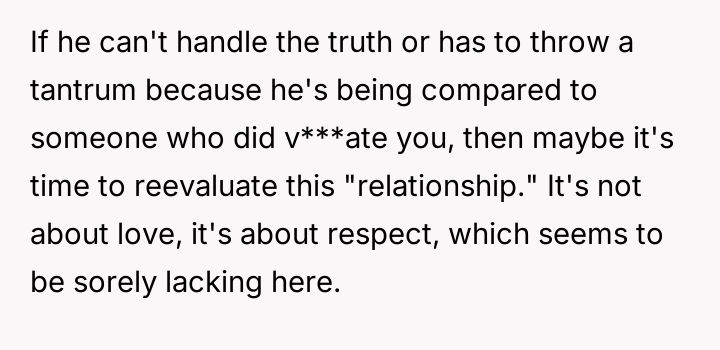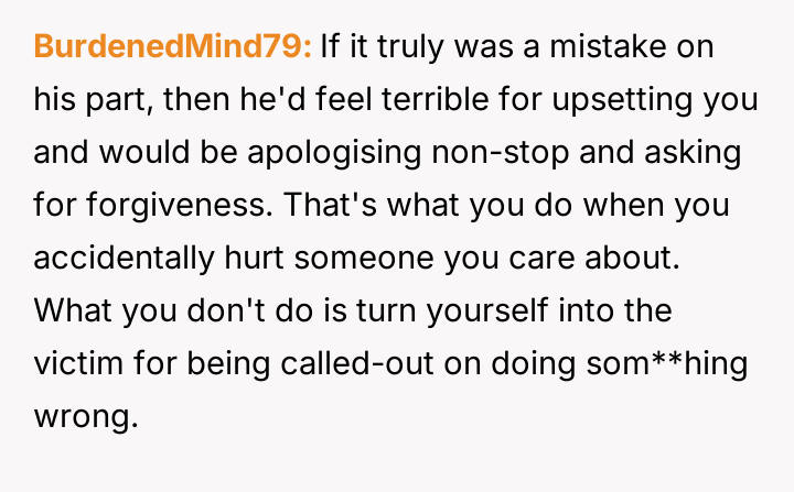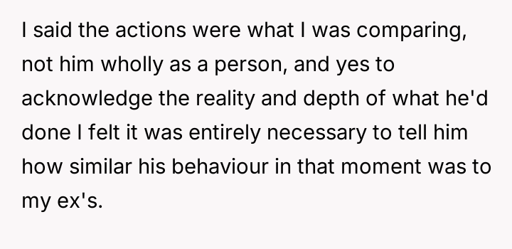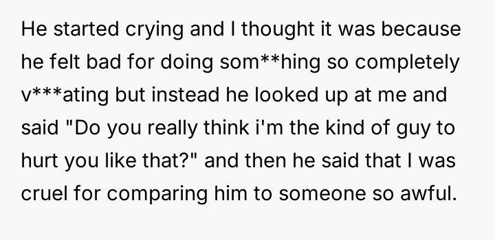 Instead of receiving validation and remorse, the OP is confronted with the boyfriend centering his own hurt feelings regarding her comparison of his actions to a past as***lt, leading to emotional labor from the OP to comfort him.