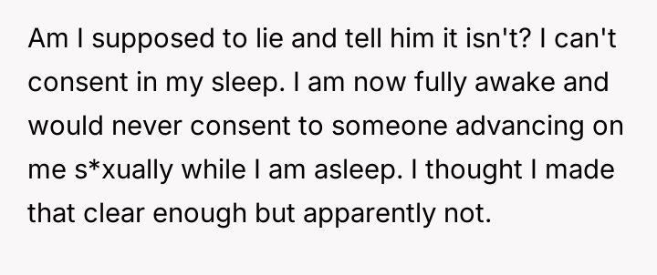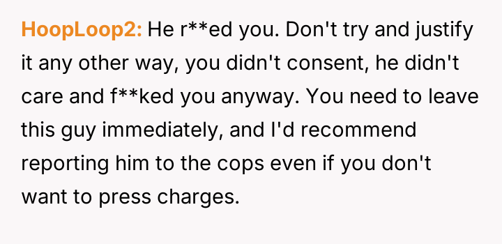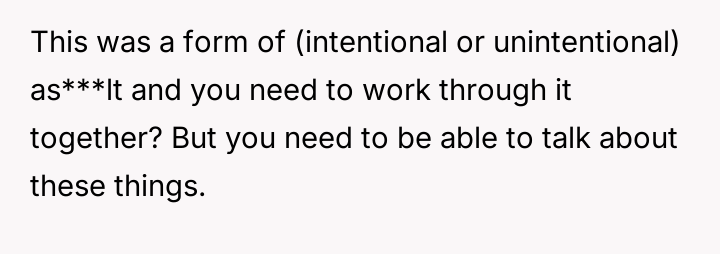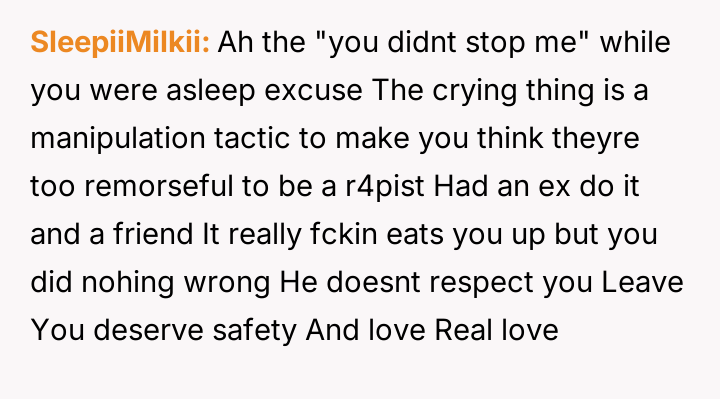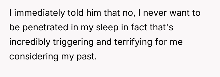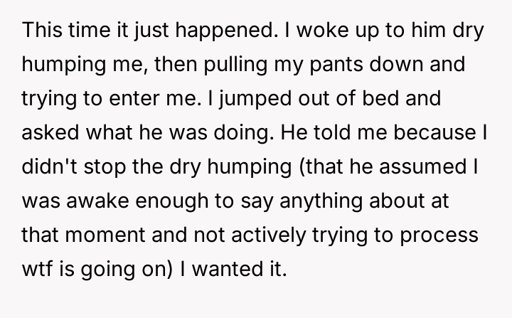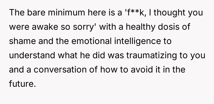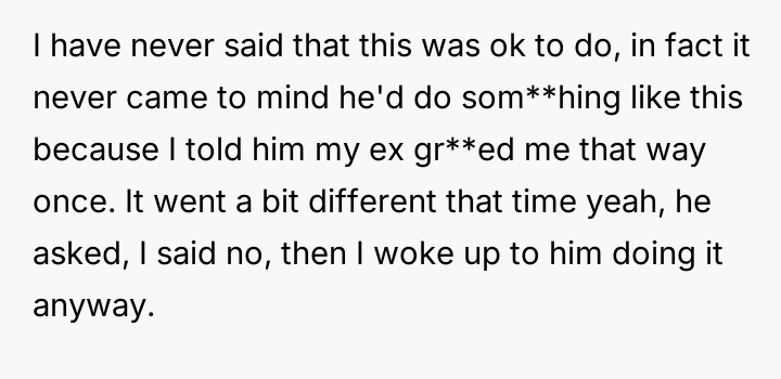 The original poster (OP) is experiencing deep feelings of v***ation and fear due to a severe breach of physical boundary by her long-term boyfriend, an act triggered by past trauma.