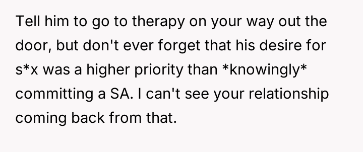 Should the OP prioritize validating her severe emotional and physical trauma by maintaining her necessary boundary articulation, or is she obligated to soften her language and actions to protect her partner's feelings and salvage the four-year relationship, especially given his current withdrawn behavior?