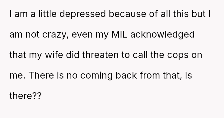 The central conflict revolves around the OP's perception of his wife's sudden hostility and her threat to involve law enforcement, which the OP sees as an unforgivable breach of trust, leading him to refuse reconciliation efforts initiated by his wife and mother-in-law.