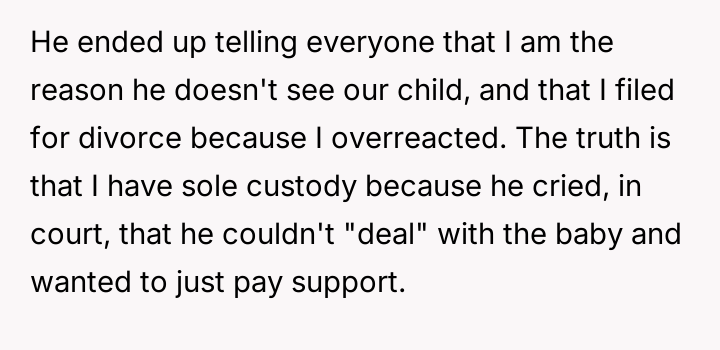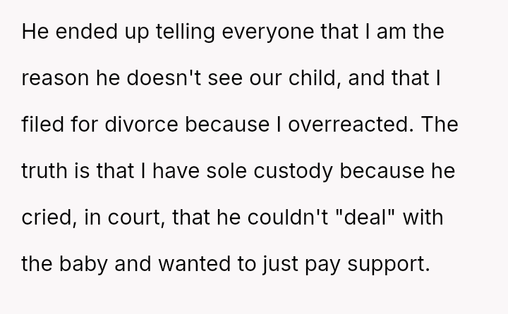 The original poster is facing significant emotional distress stemming from her ex-partner's decision to abandon his parental responsibilities and spread misinformation regarding the custody arrangement.