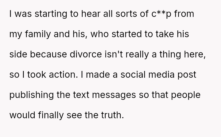Her decision to publicize private, deeply offensive text messages was a direct response to external pressure and the need to defend herself and her child against accusations of overreaction and parental alienation.