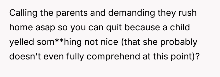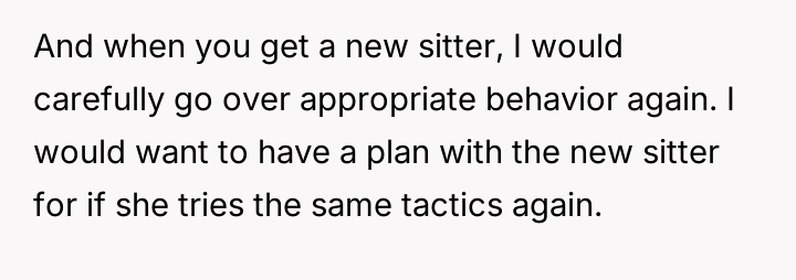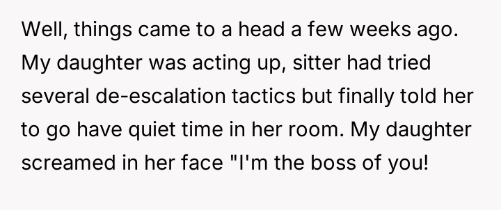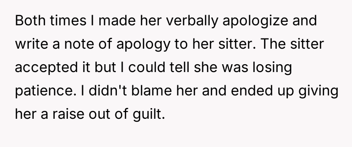 Despite the OP implementing increasing disciplinary measures, including consequences and apologies, the behavior escalated until the sitter felt compelled to quit immediately, leaving the family scrambling for childcare solutions.