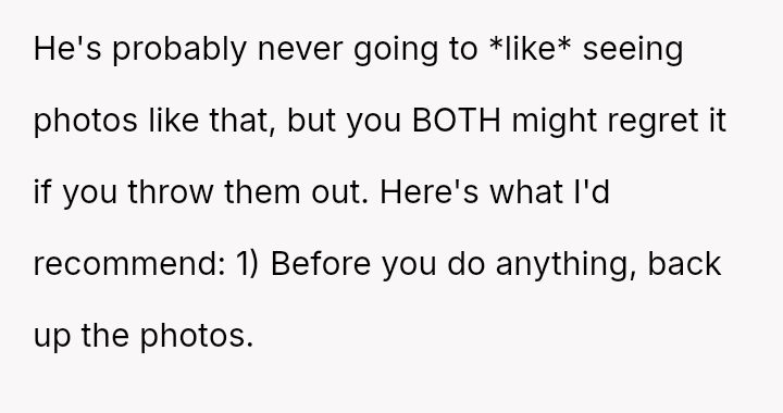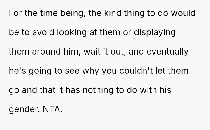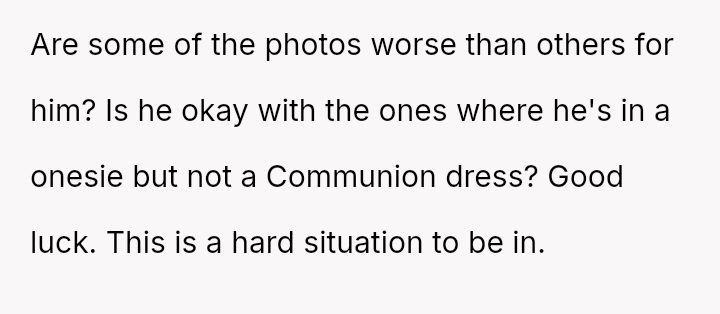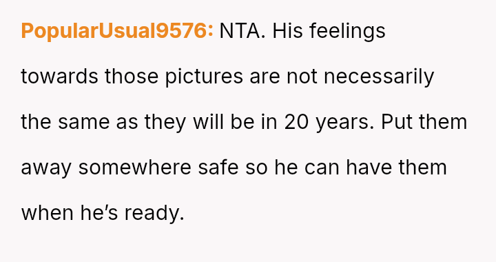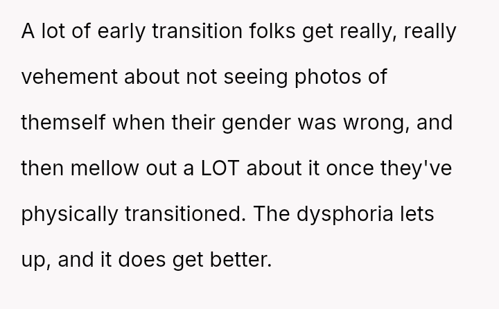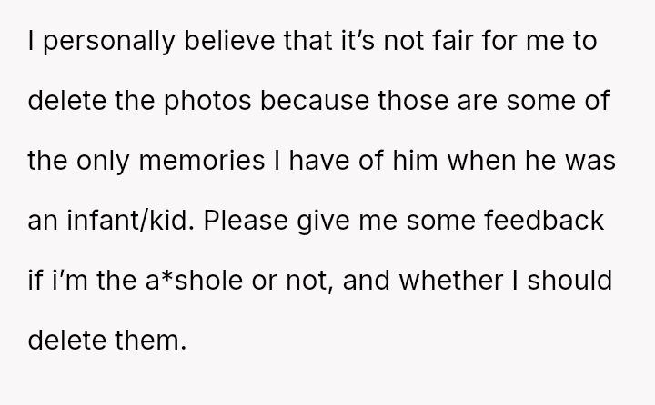 Is the mother wrong for wanting to preserve memories of her child's infancy, even if those memories conflict with his current gender ident*ty, or must she erase those specific visual records to fully affirm his present self?