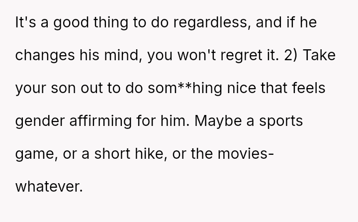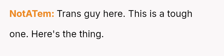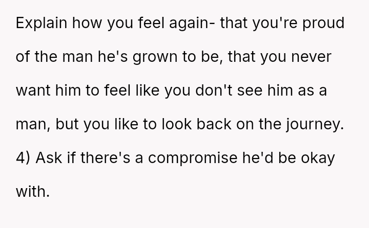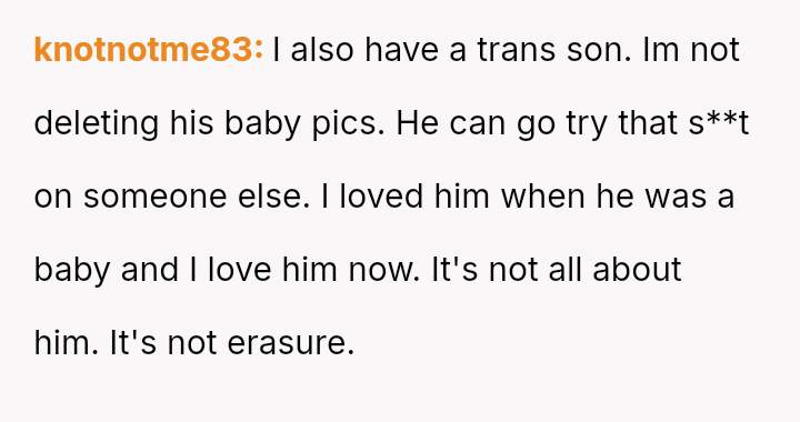 The OP's conflict stems from balancing her desire to keep personal memories of her child's early life against her son's current need for validation regarding his gender ident*ty and transition.