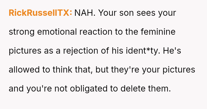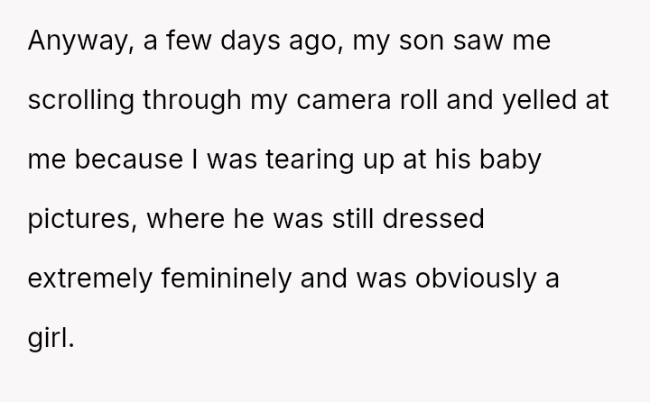 The original poster (OP) feels hurt because her son accused her of being transphobic for keeping childhood photos where he appeared feminine.