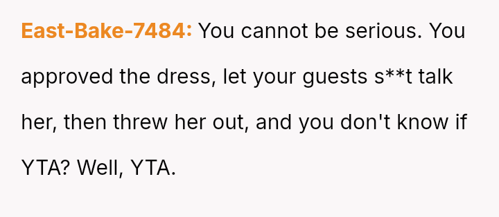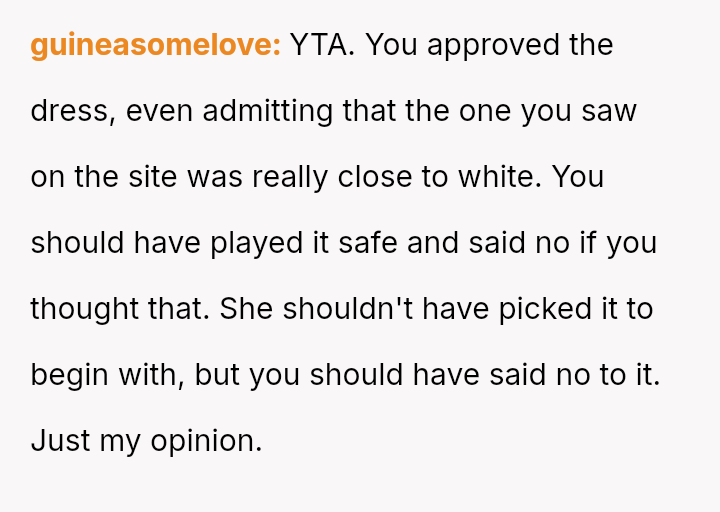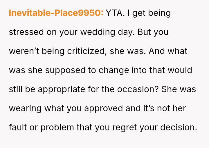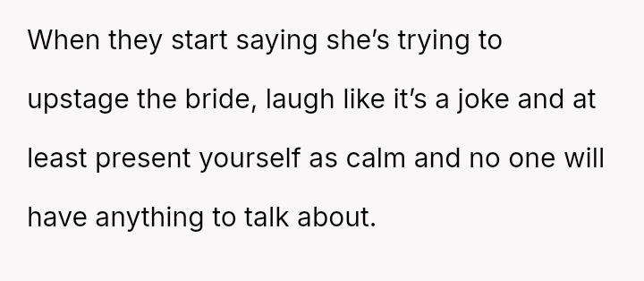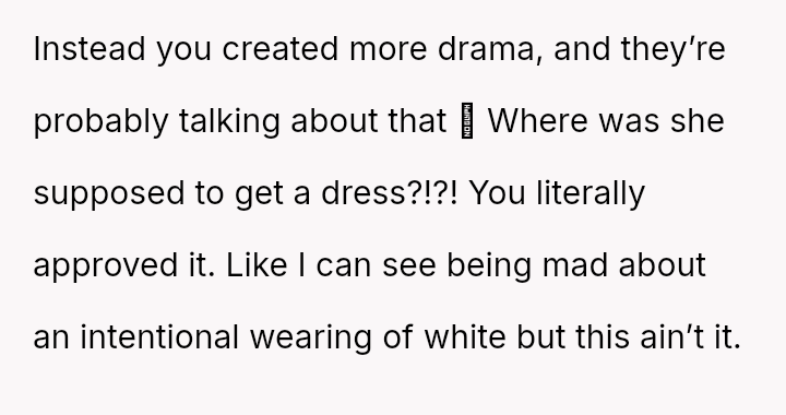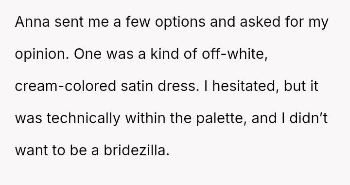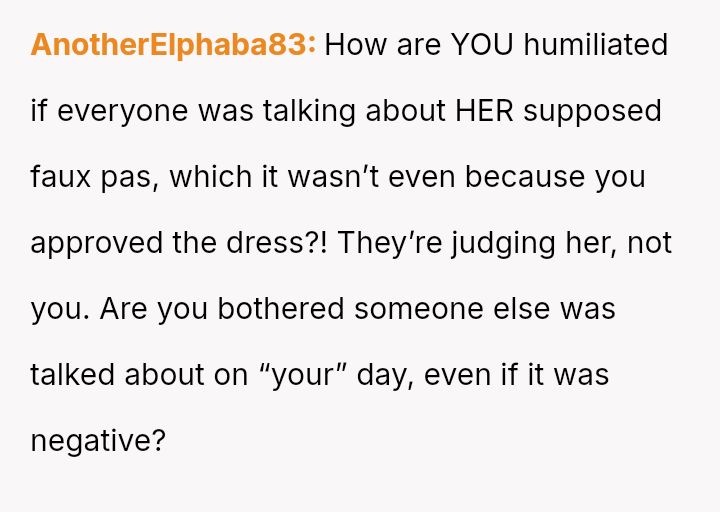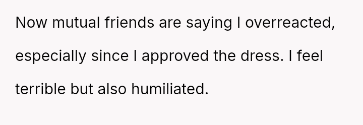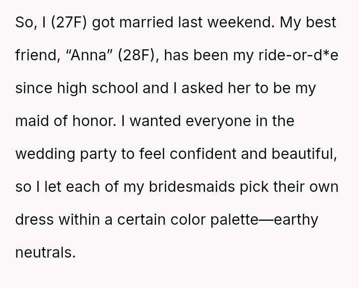 The original poster experienced significant stress on her wedding day when her maid of honor wore a dress that appeared nearly white, leading to guest commentary and feelings of humiliation for the bride.
