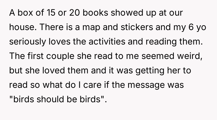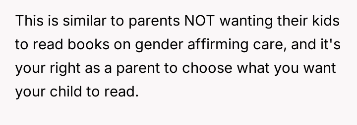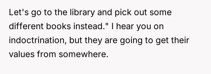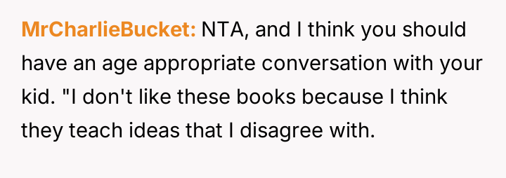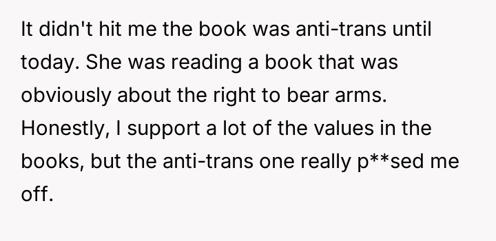 The original poster (OP) is caught between a desire to shield their six-year-old daughter from content they strongly disagree with (specifically anti-trans messaging) and the desire to encourage her es**blished reading habit, which is currently being fostered by a collection of engaging books.