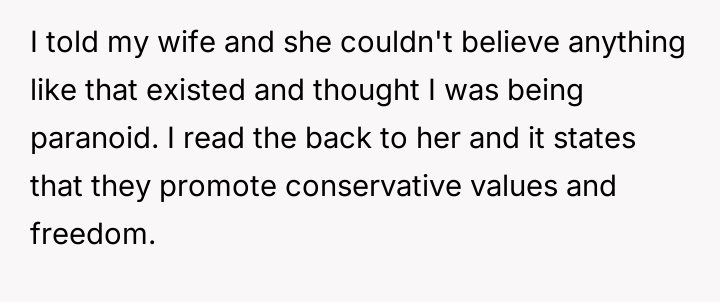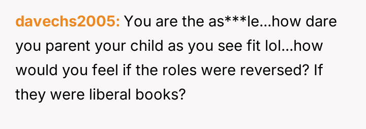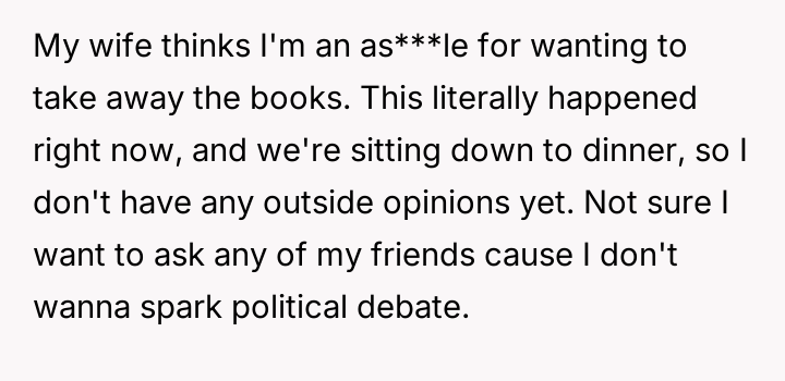 This has created a direct conflict with the OP's spouse, who views the books as innocuous or even positive due to their generalized themes of freedom and conservative values, leading the OP to feel isolated and questioning their next action.