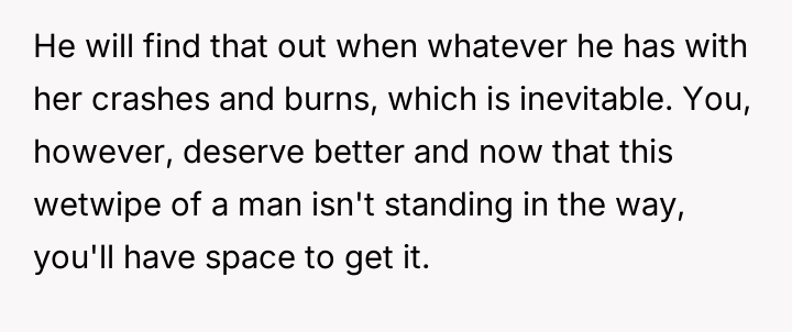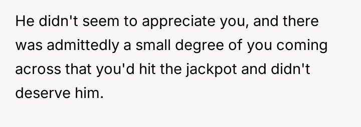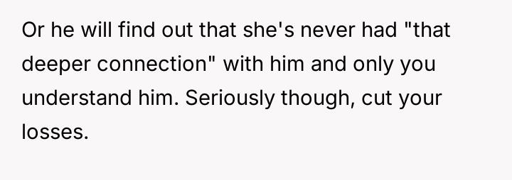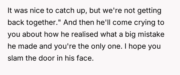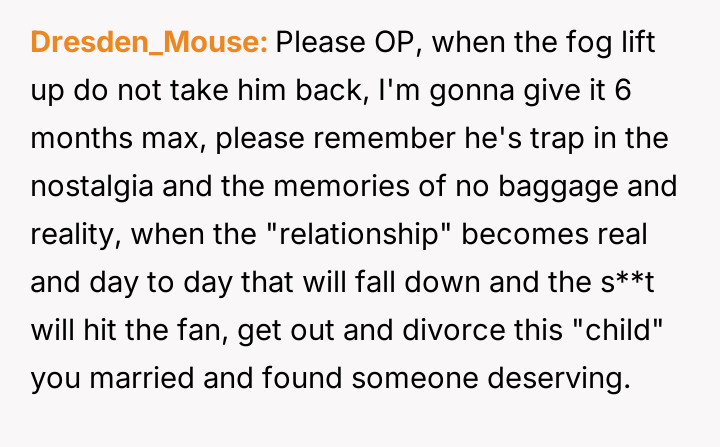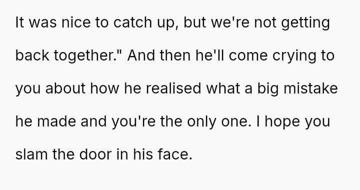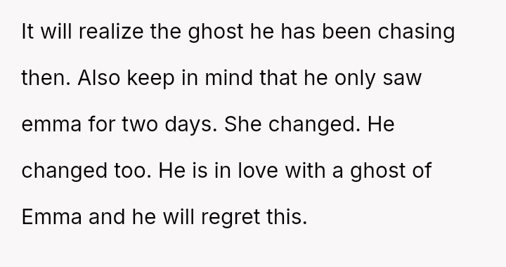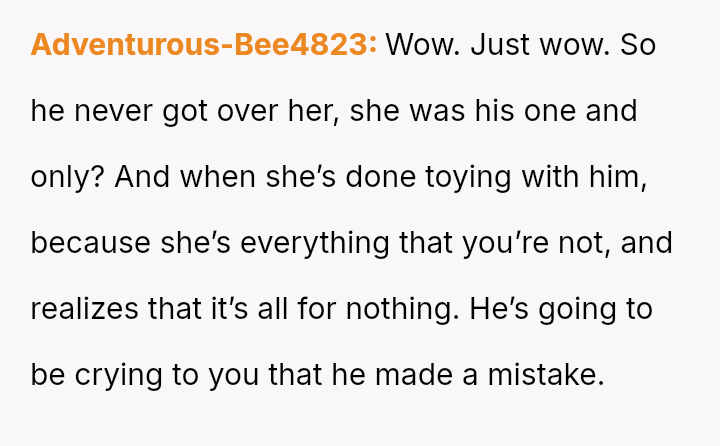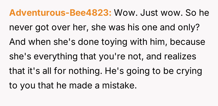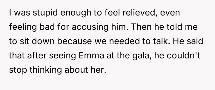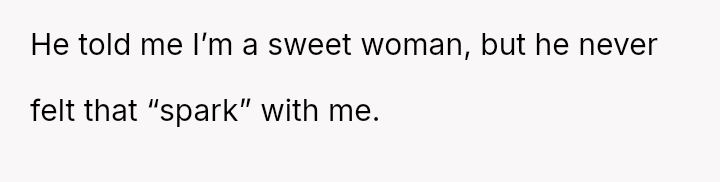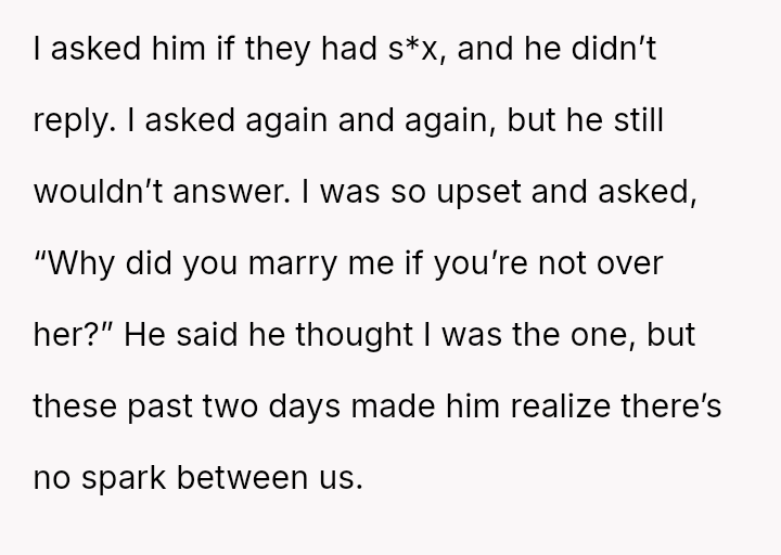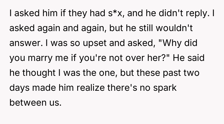 He explained that seeing her made him realize their connection was much stronger, stating he never felt a 'spark' with the OP and suggesting they should separate. This confrontation left the OP feeling stunned and questioning the foundation of their marriage.