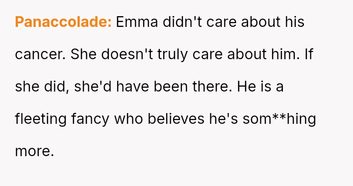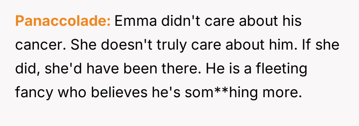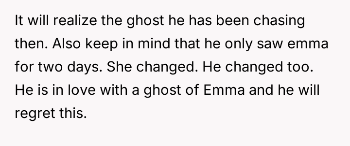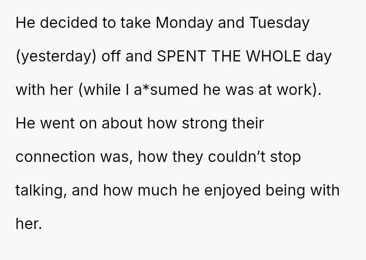 However, the partner then initiated a serious conversation, revealing he had taken two days off work, pretending to be at work while he actually spent the entire time with Emma.