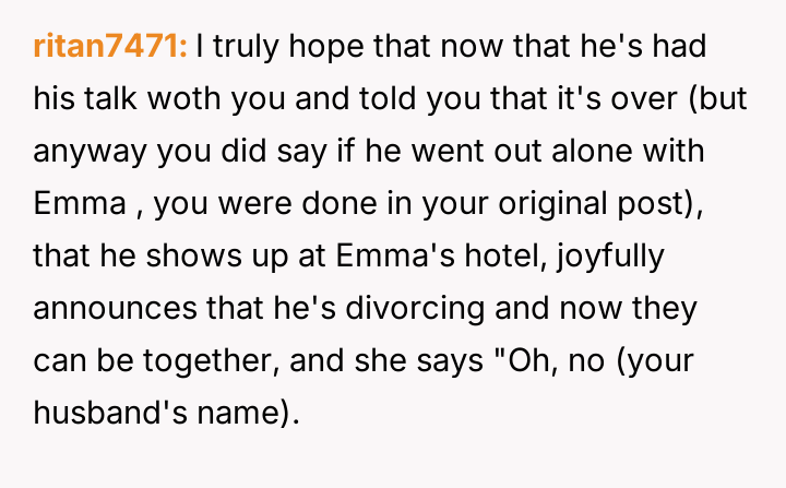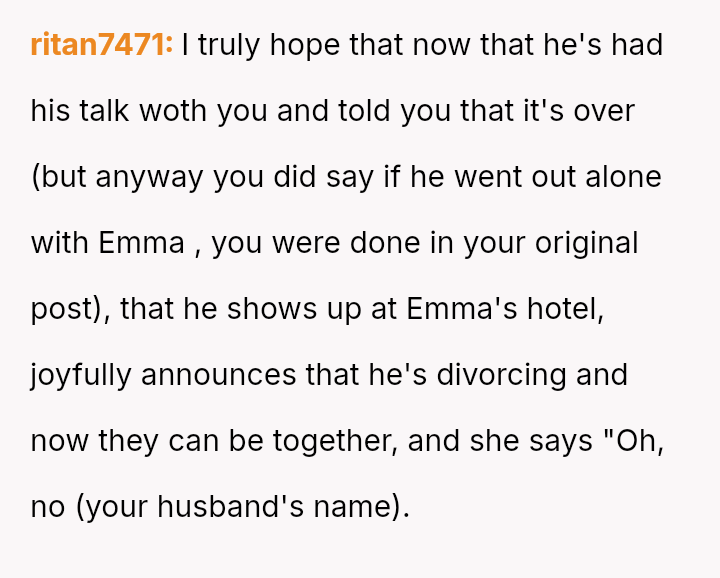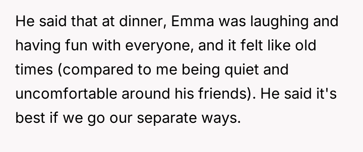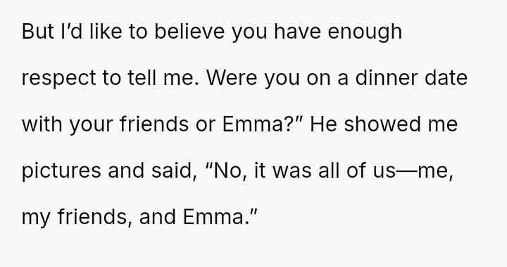 Her partner showed her pictures confirming it was a group setting involving friends and Emma, which initially caused the OP to feel relieved and even guilty for suspecting him.
