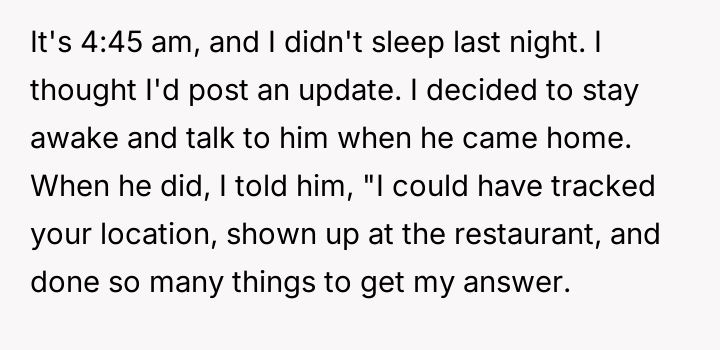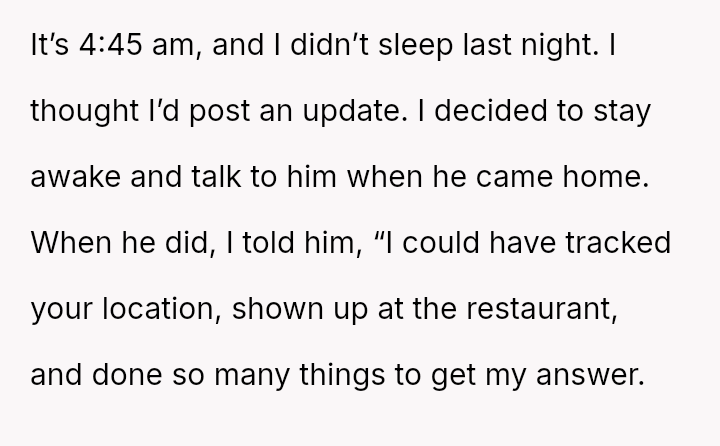 The original poster (OP) stayed awake to confront her partner after he was out late. She questioned him directly about whether his outing was a dinner date with his friends or another woman named Emma.