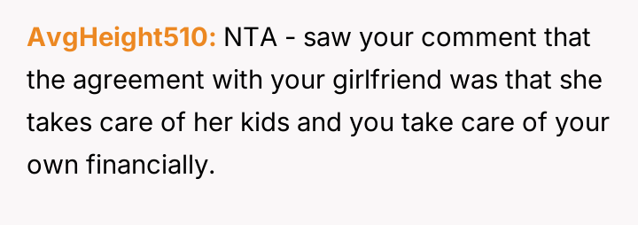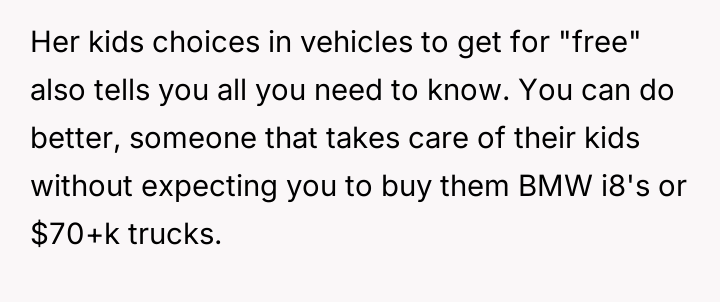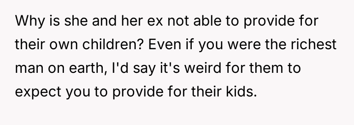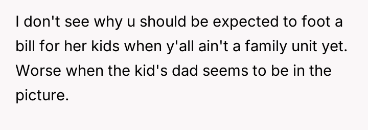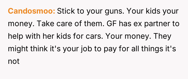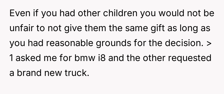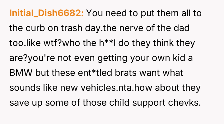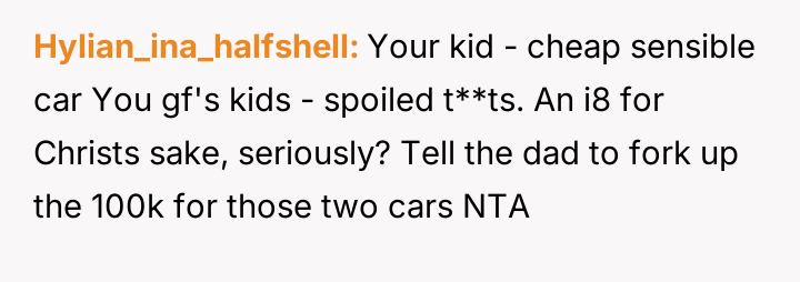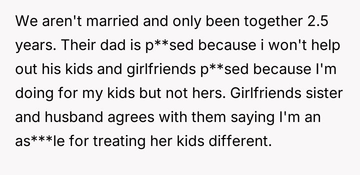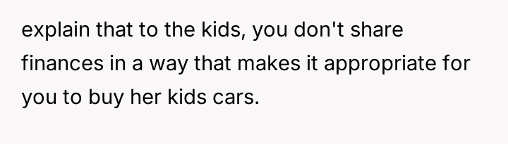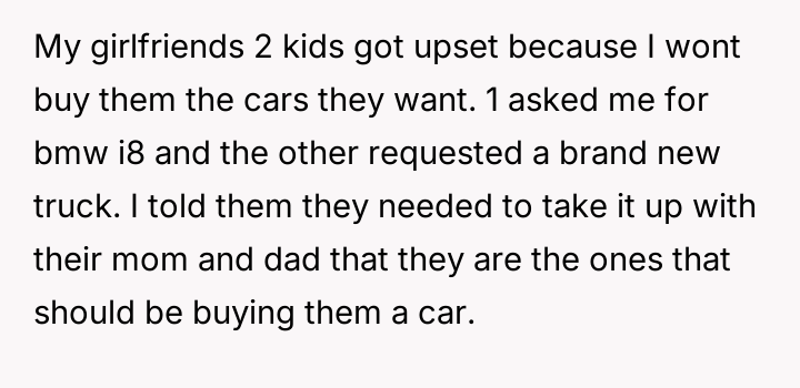 Given the clear distinction between financial obligations to one's own child versus a partner's child in a relationship that is not legally bound by marriage, is the OP justified in refusing to fund the extravagant car requests of his girlfriend's children, or does this refusal const*tute unfair differential treatment that threatens the s**bility of his current relationship?