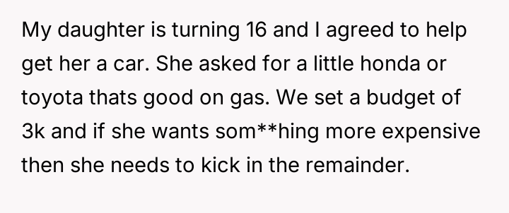 A father, filled with love and responsibility, prepares to gift his daughter a modest car for her 16th birthday—an honest promise grounded in budget and fairness.