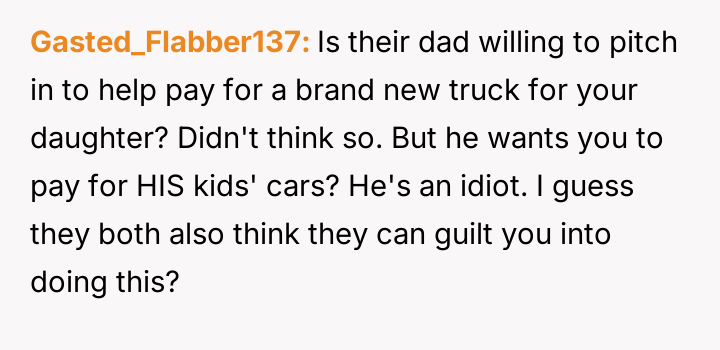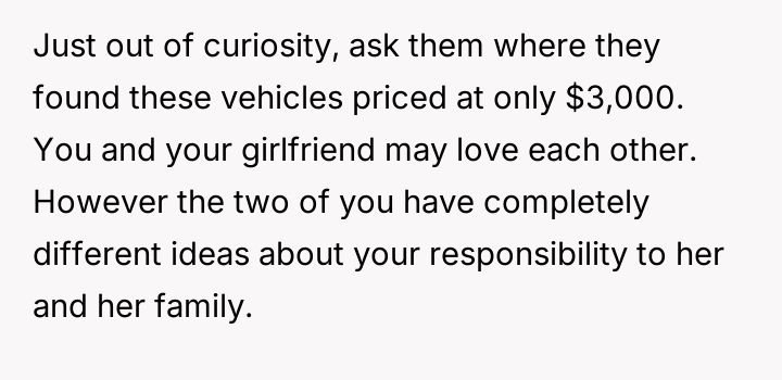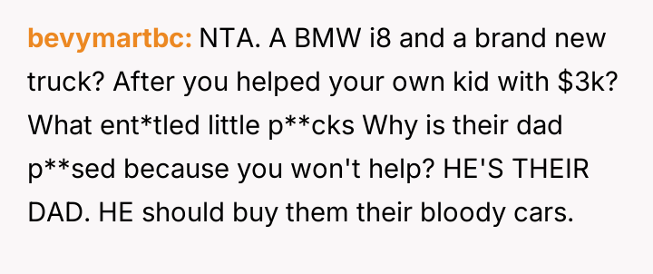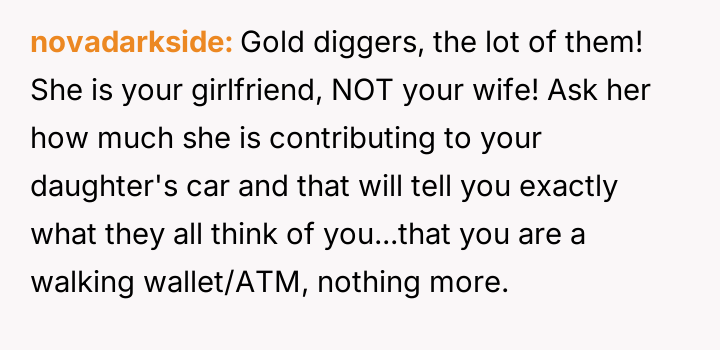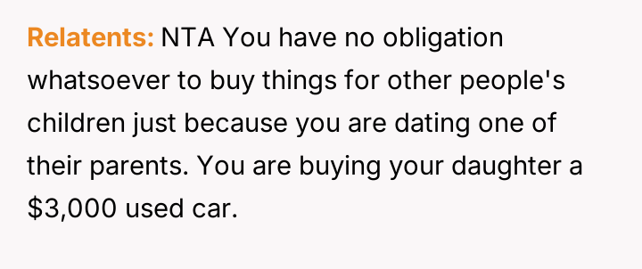 The original poster (OP) is facing significant conflict after setting a clear financial boundary regarding a car purchase for his biological daughter, which his girlfriend's children and extended family have strongly rejected.