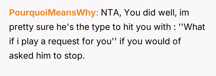 The original poster (OP) felt annoyed by a stranger imposing music on them in a public space and chose to resolve the situation by quietly relocating, believing this passive withdrawal avoids conflict.