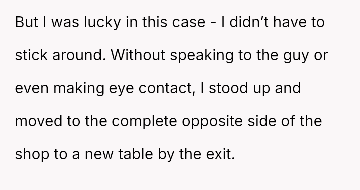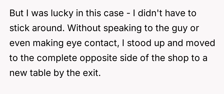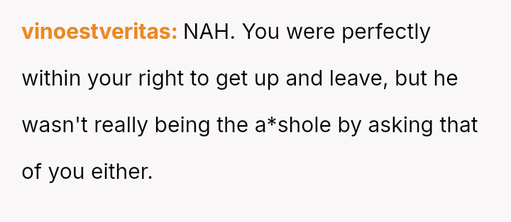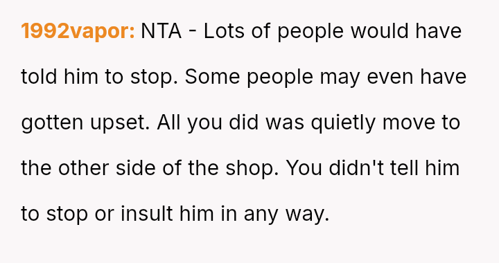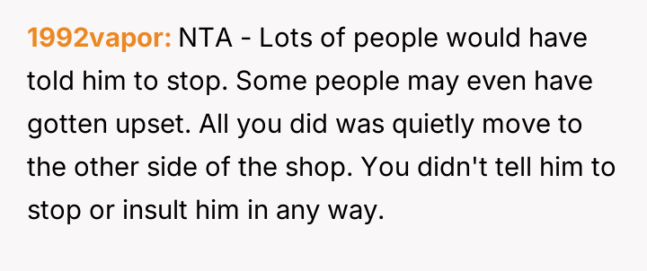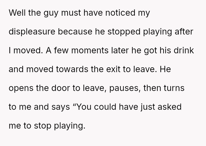 The stranger, however, confronted the OP upon leaving, stating that the OP should have used direct verbal communication instead of silently leaving, creating a conflict over the appropriate social response to minor public nuisances.