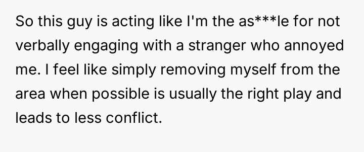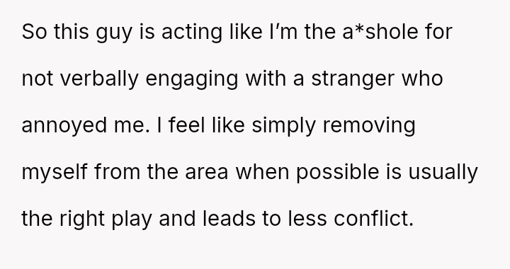 Is the OP correct in prioritizing self-removal to avoid conflict when annoyed by a stranger's public behavior, or was the stranger justified in requesting direct communication as a baseline for human interaction, even in a casual public setting?
