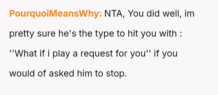 The original poster (OP) felt annoyed by a stranger imposing music on them in a public space and chose to resolve the situation by quietly relocating, believing this pa*sive withdrawal avoids conflict.