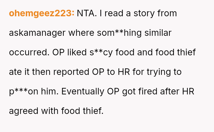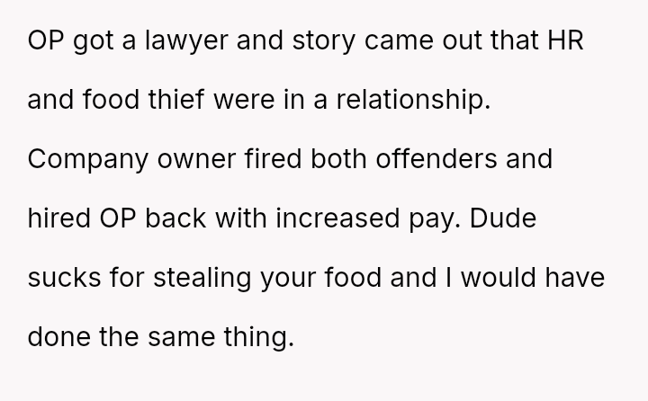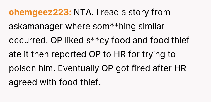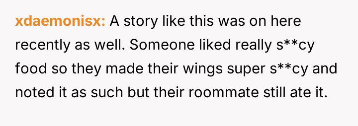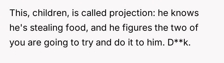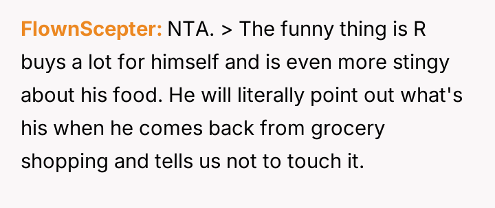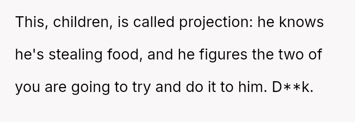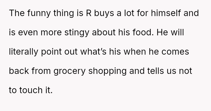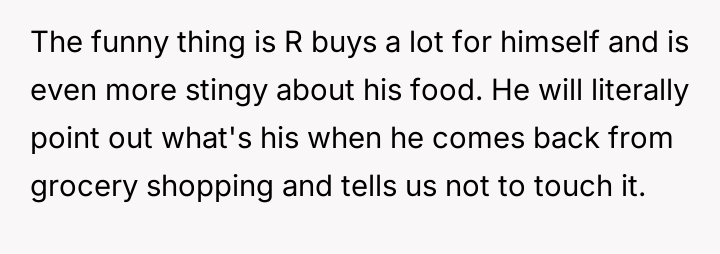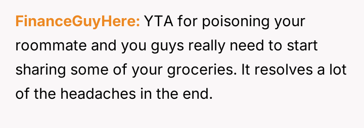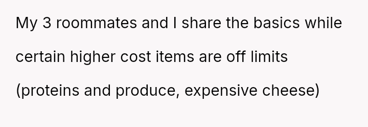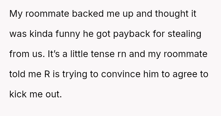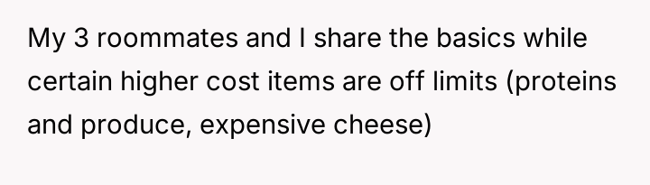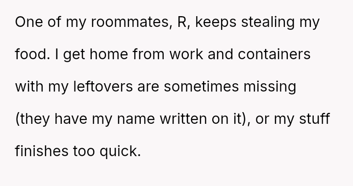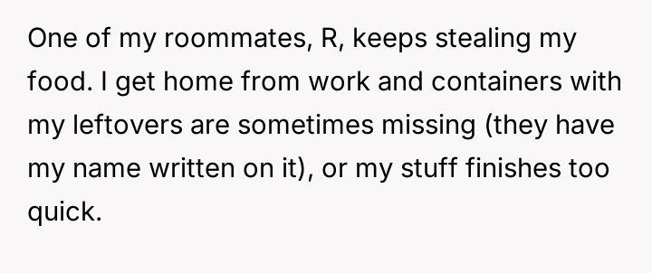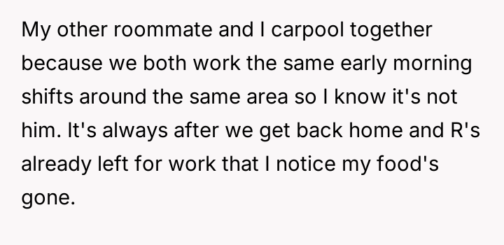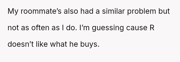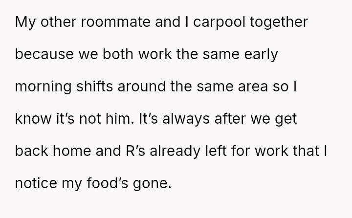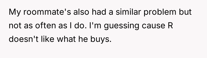 The original poster (OP) experienced persistent theft of personal groceries by a roommate (R), which escalated after repeated denials and gaslighting from R.