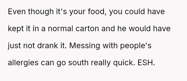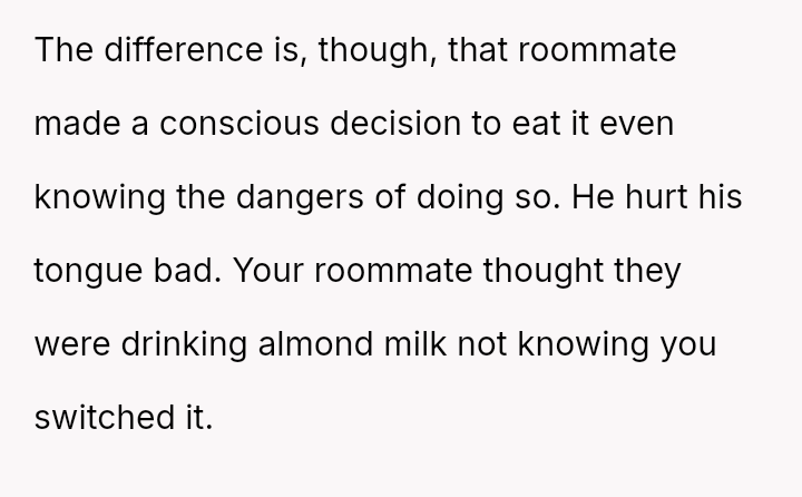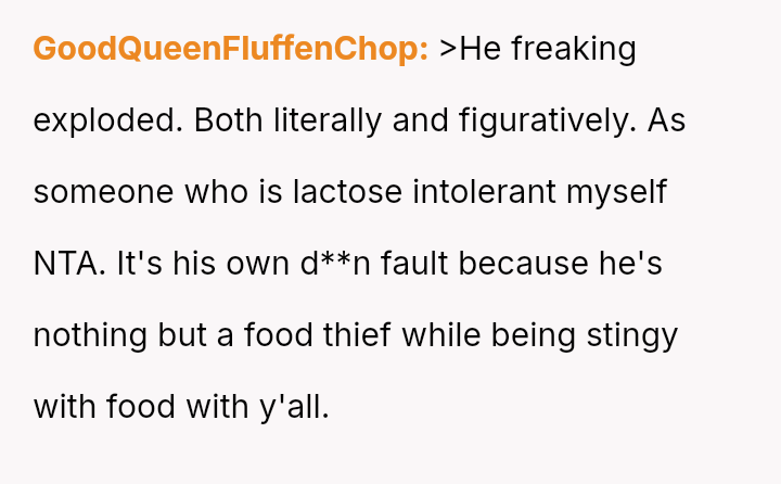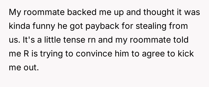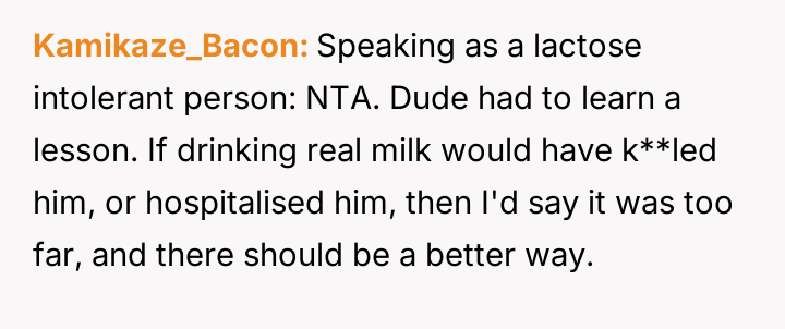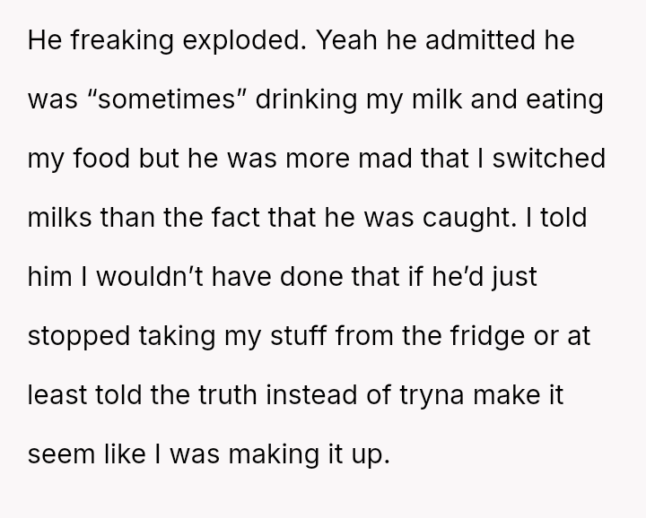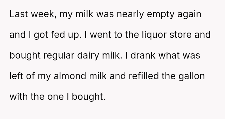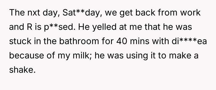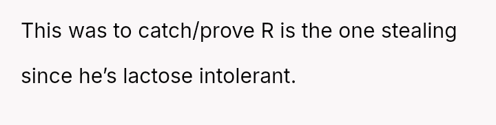 The conflict climaxed when the OP set a trap using lactose-containing milk, successfully exposing R's dishonesty, though R reacted more strongly to the trap than to the initial act of theft.