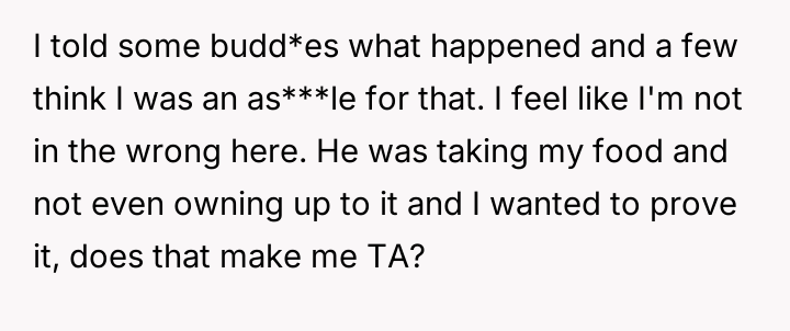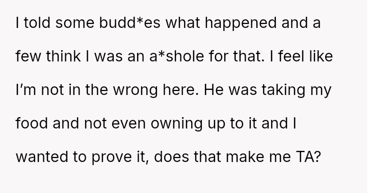 Given the clear v***ation of agreed-upon boundaries and the subsequent denial, was the OP justified in setting a trap to expose the repeated food theft, or did this action create an unnecessarily hostile living environment?"