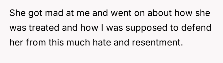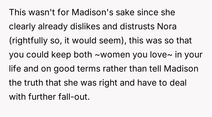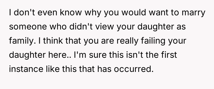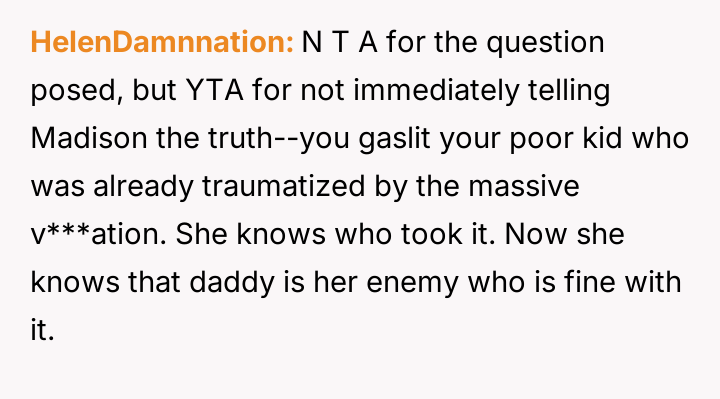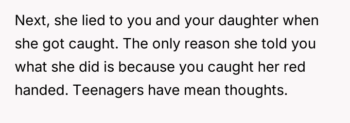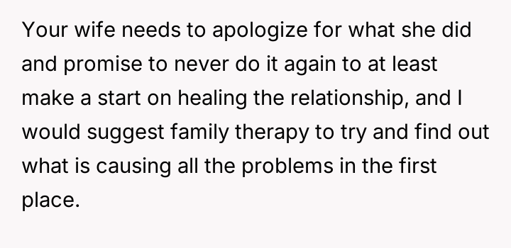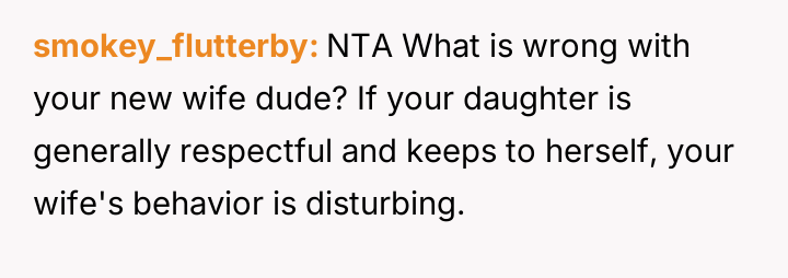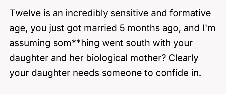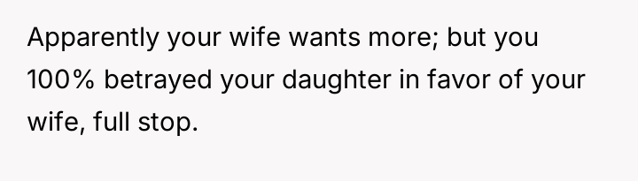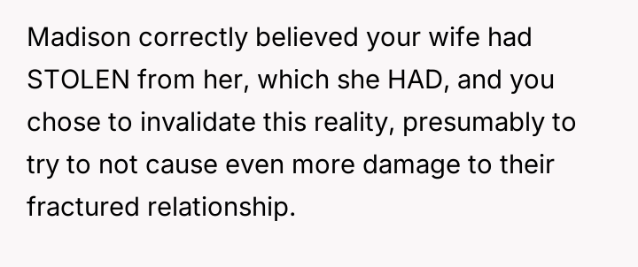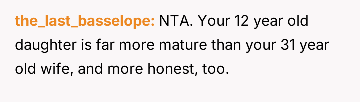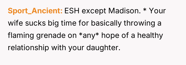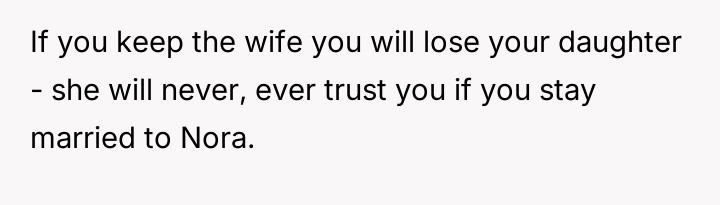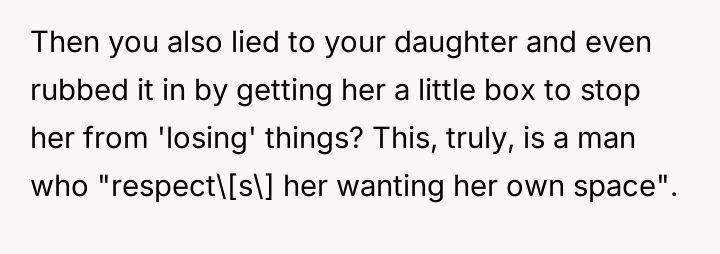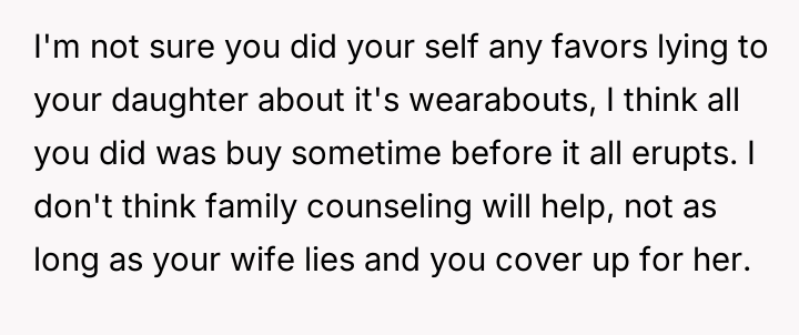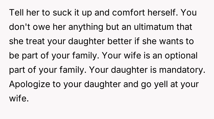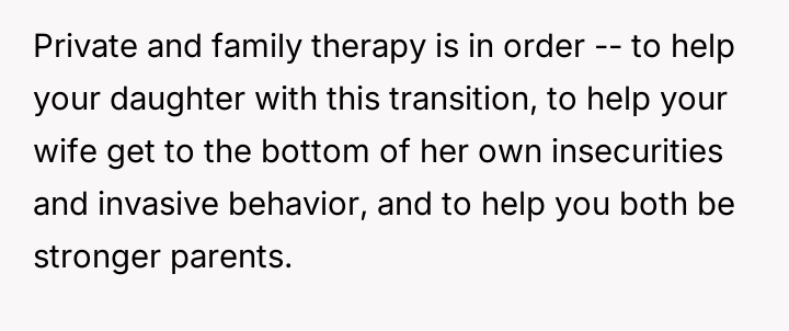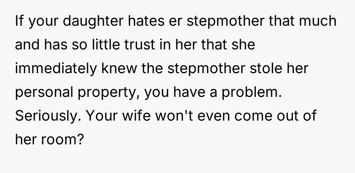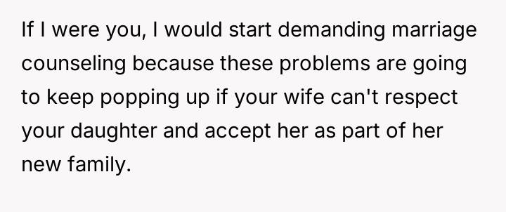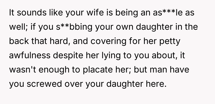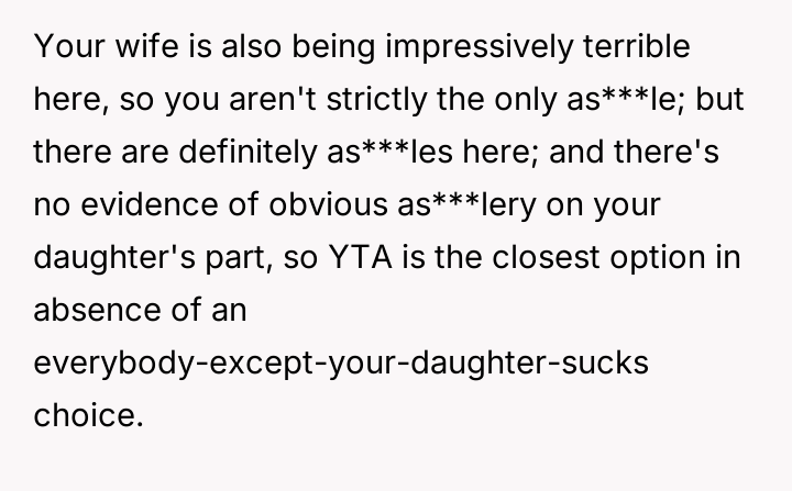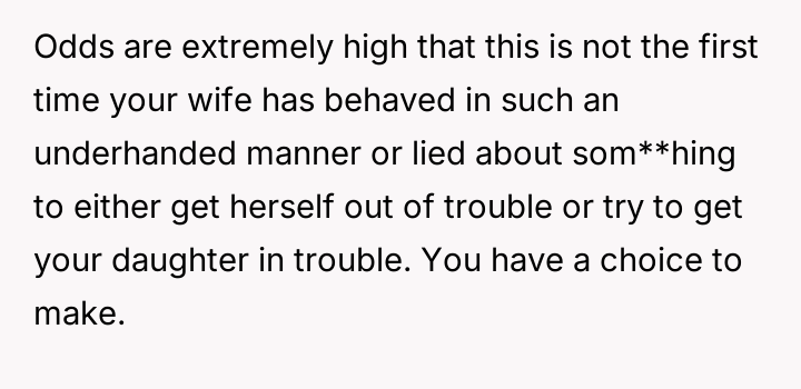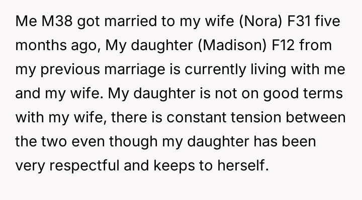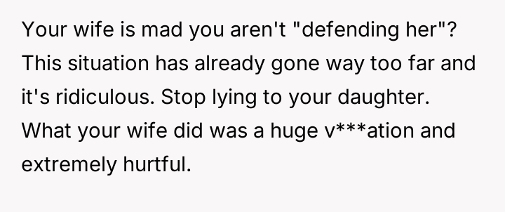 The core conflict rests on the father's choice to side with his daughter's need for privacy and safety over immediately validating his wife's feelings of being targeted and unloved.