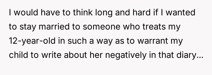 Given the es**blished tension and the breach of privacy, was the father's decision to secretly confront his wife and then lie about finding the diary the right way to support both parties, or should he have addressed the boundary v***ation publicly first?