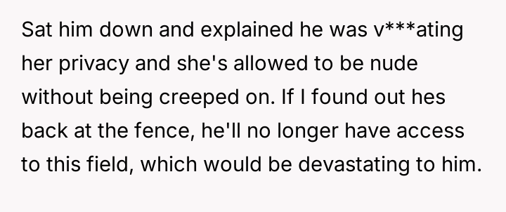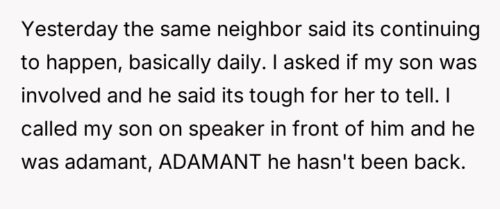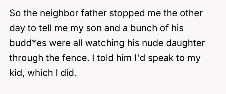 The original poster (OP) took immediate action to address the neighbor's concern by speaking to his son and threatening loss of access to the local recreation field.