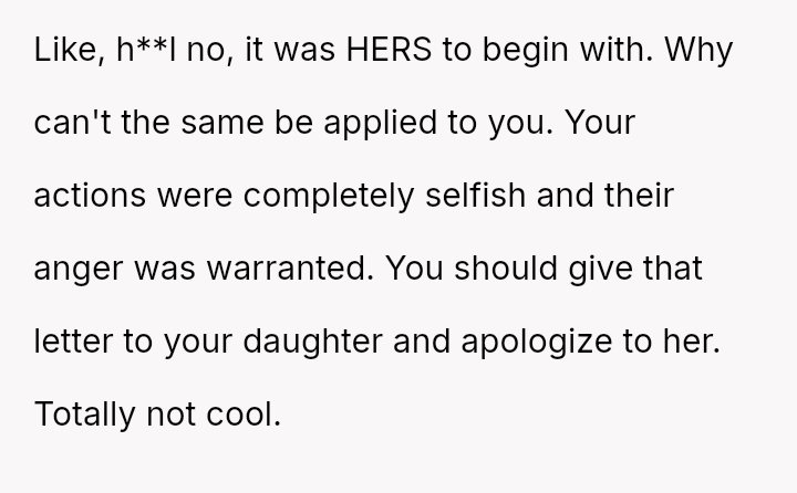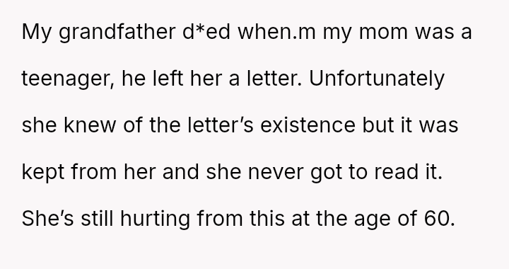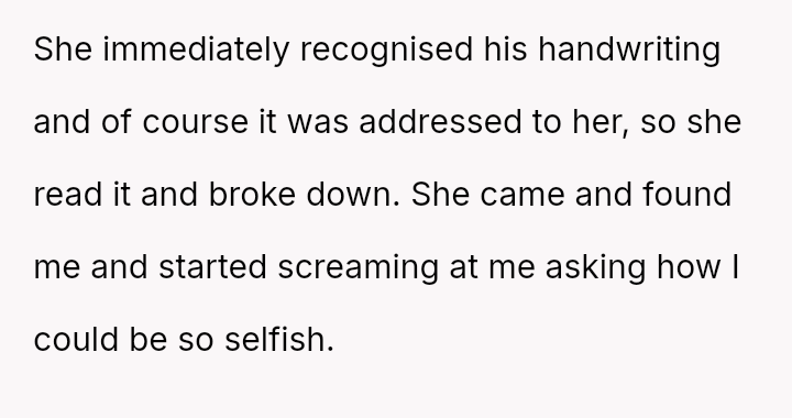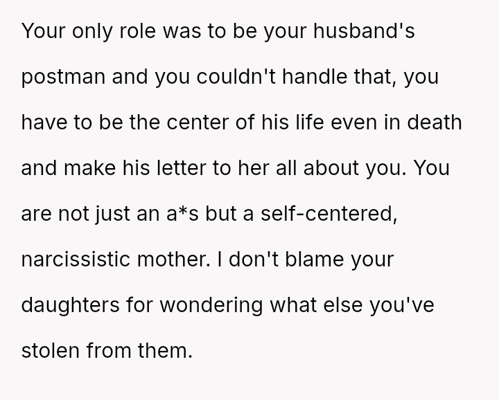 Her attempt to safeguard this final connection has directly conflicted with her daughter's expectation and right to receive the intended message on her significant day, leading to accusations of selfishness and severe family distress.