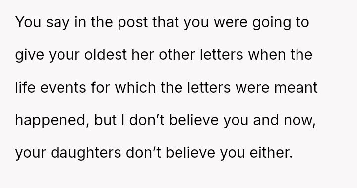 The original poster (OP) is struggling deeply with the loss of her husband, manifesting as an intense need to hold onto tangible memories, specifically the letter he wrote for her elder daughter's wedding.