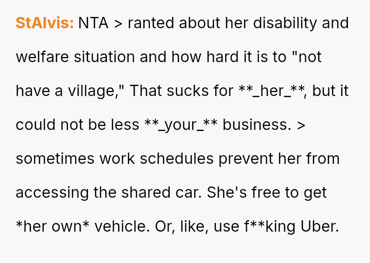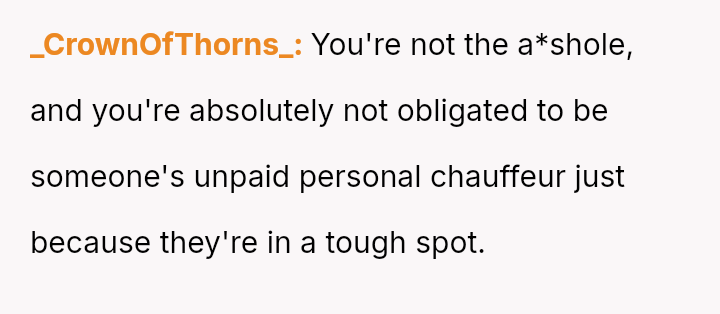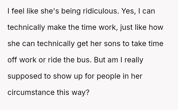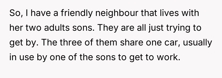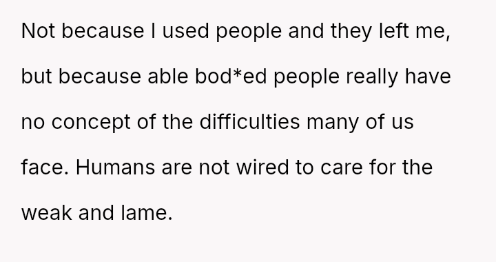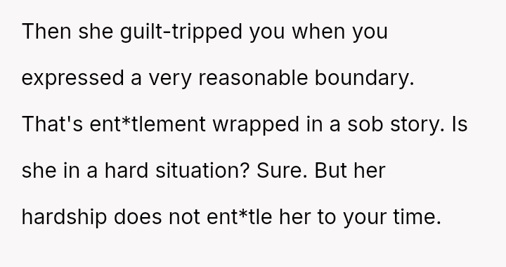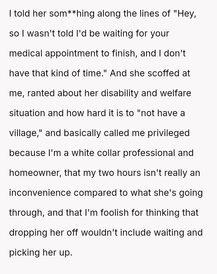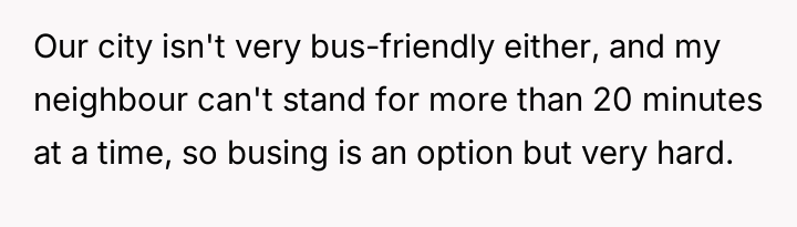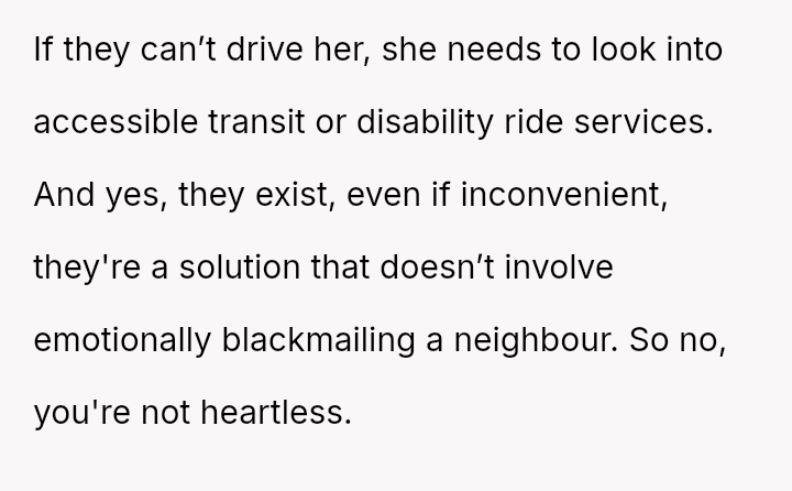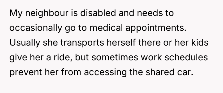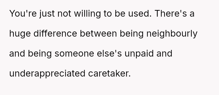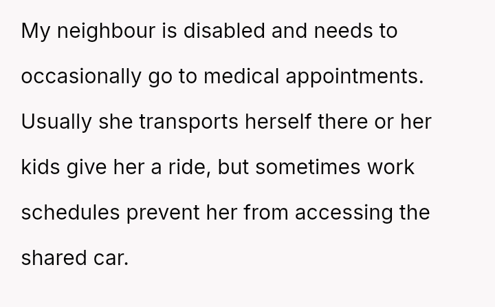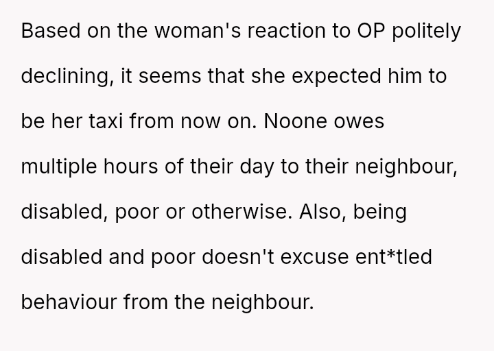 The neighbor, conversely, leveraged her significant disability and lack of support systems to justify the imposition, viewing the OP's time as less valuable due to their current employment status and home ownership.