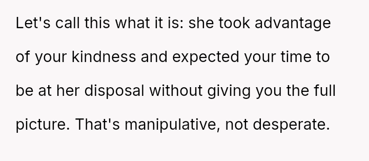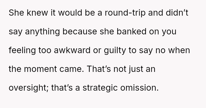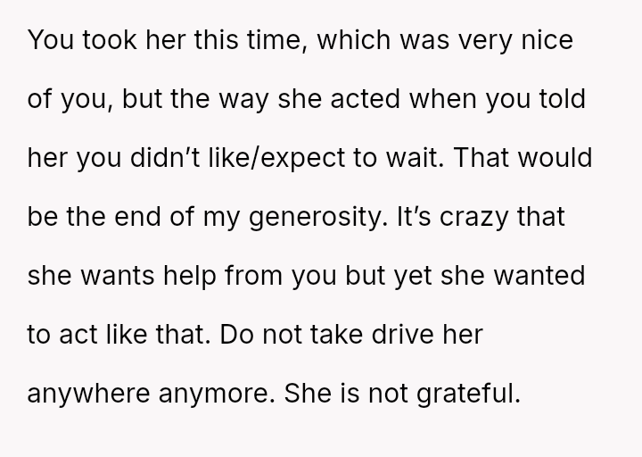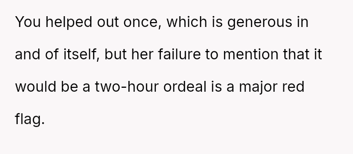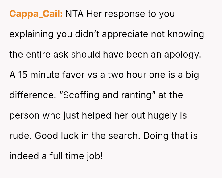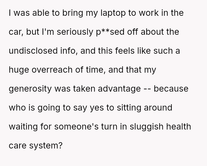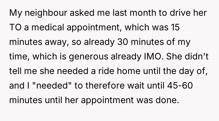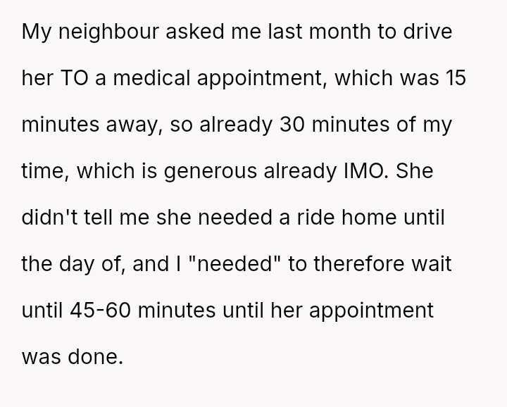 The original poster (OP) feels that their neighbor took advantage of their offer of help by failing to disclose the need for a return trip and extended waiting time, leading to a significant, uncompensated use of the OP's limited time.