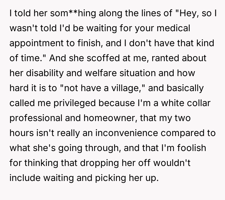 AITA for telling my disabled neighbour on welfare that I won't help her with getting to her medical appointments?