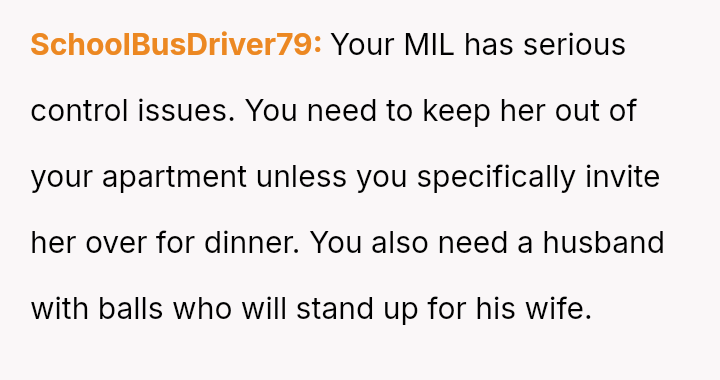 The central conflict lies between the OP's need to es**blish autonomy as a newly married adult and the MIL's persistent attempt to maintain authority over the couple's living space, a situation the husband has chosen to avoid addressing directly.
