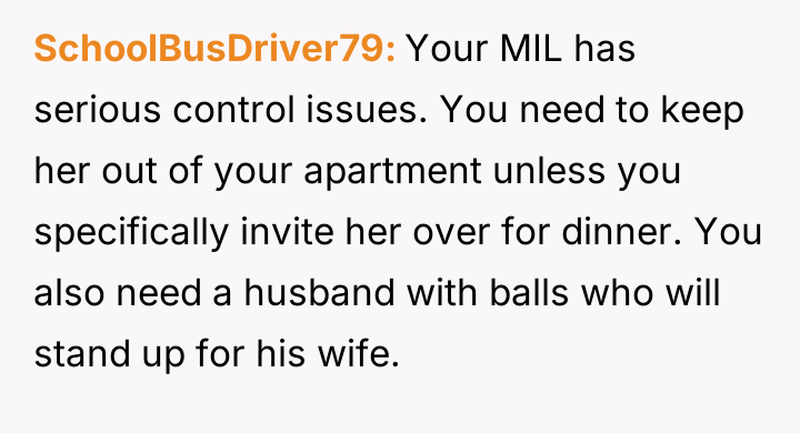The central conflict lies between the OP's need to establish autonomy as a newly married adult and the MIL's persistent attempt to maintain authority over the couple's living space, a situation the husband has chosen to avoid addressing directly.
