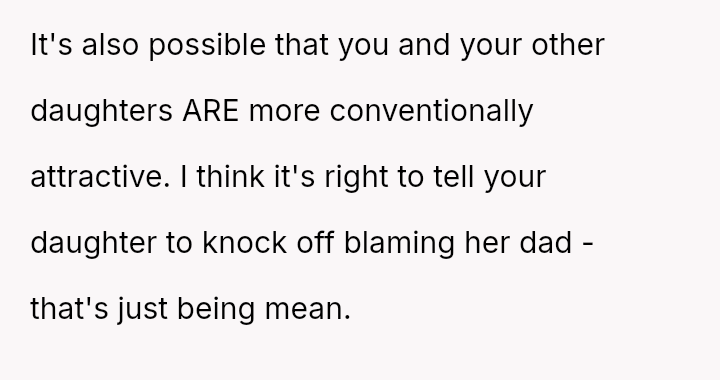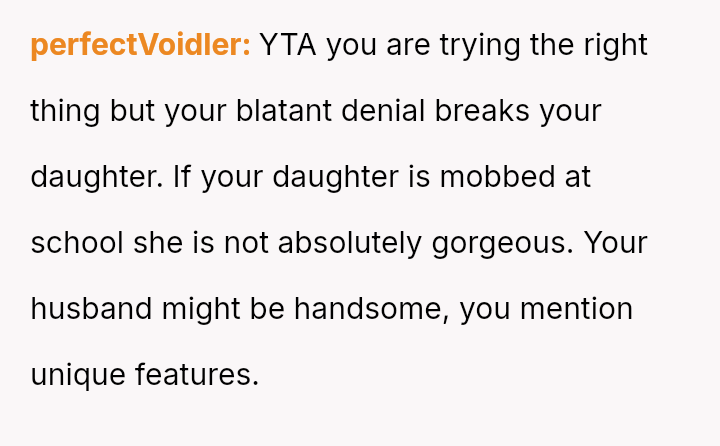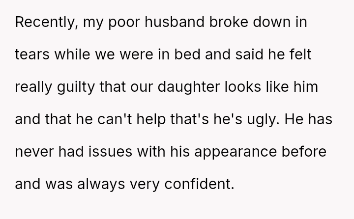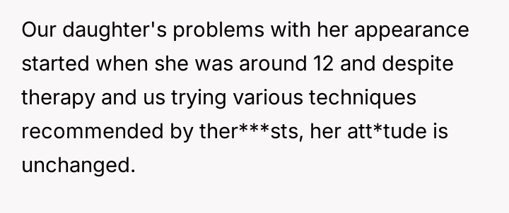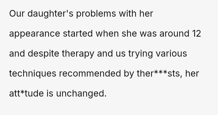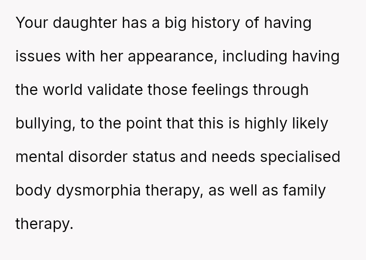 The central conflict lies in the OP's firm stance against validating the daughter's destructive beauty standards and demanding plastic surgery, which directly clashes with the daughter's extreme withdrawal and the husband's resulting guilt and broken confidence.