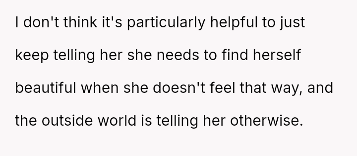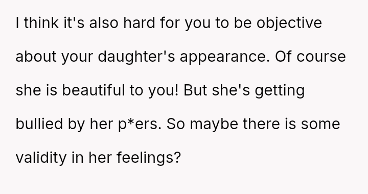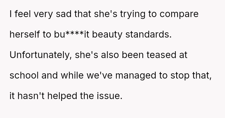 Despite the love and efforts of her parents, she battles the cruel whispers of schoolyard taunts and the unforgiving mirror of societal beauty standards, struggling to see herself through a kinder lens.