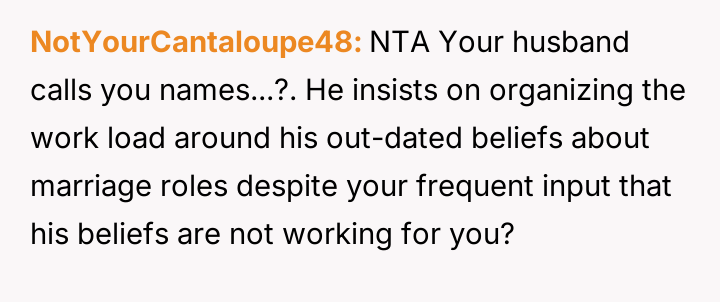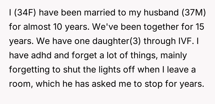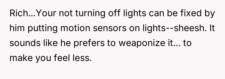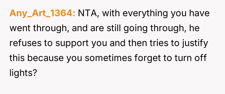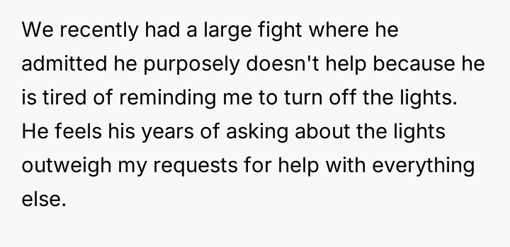 The central conflict lies in the OP's need for partnership and support versus the husband's adherence to traditional gender roles and his use of minor infractions, like leaving lights on, as justification for withholding meaningful help.