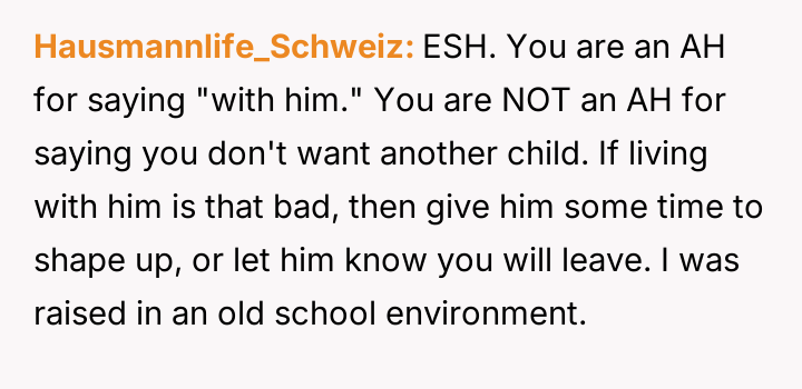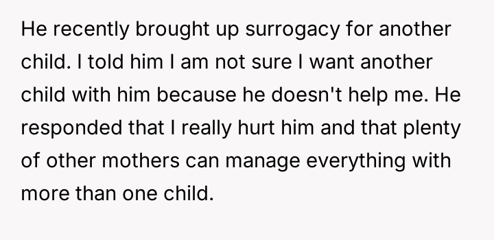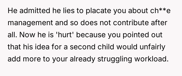 Is the OP justified in expressing her desire to halt plans for a second child due to her husband's lack of support, or did this statement const*tute an unfair reaction to his frustration over small household tasks?