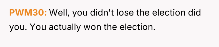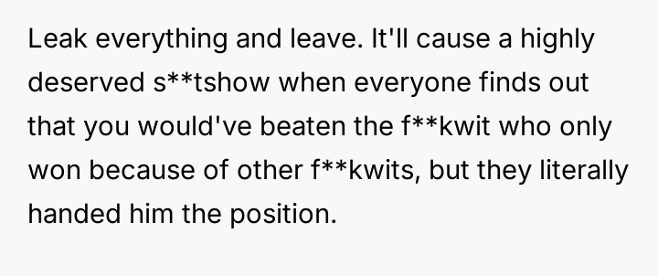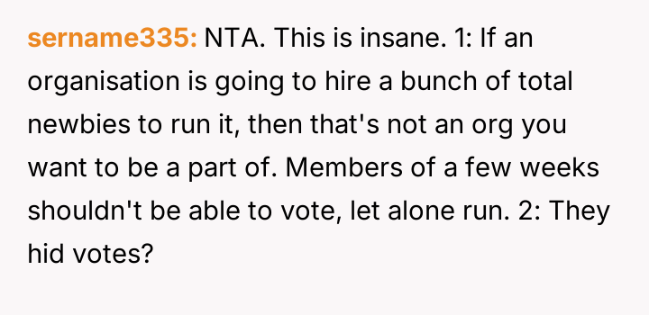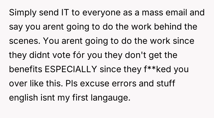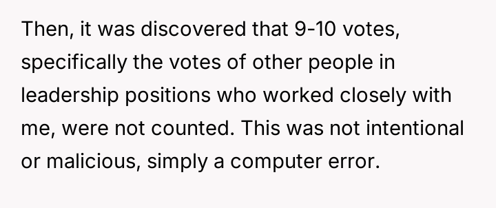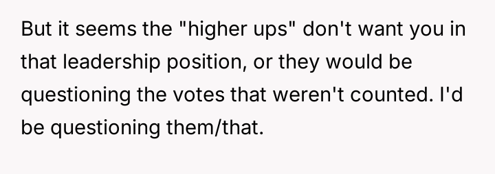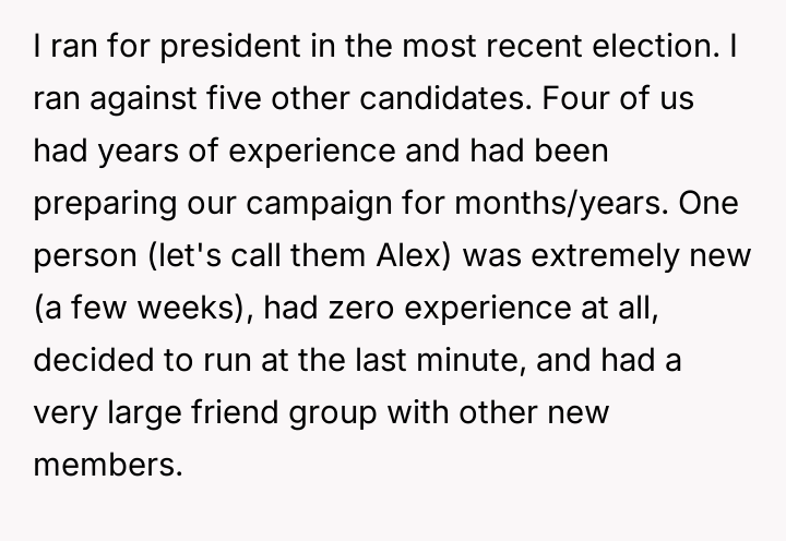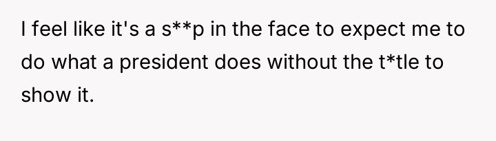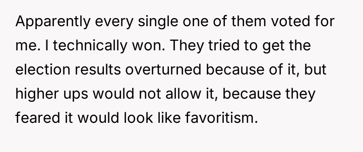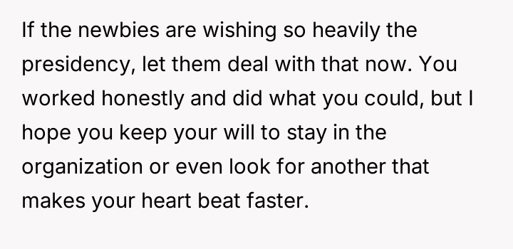 The original poster (OP) feels deeply undervalued and disrespected after extensive commitment to the organization, culminating in an election loss that was overturned internally due to a technical error, after which they were pressured to perform presidential duties without the t*tle.