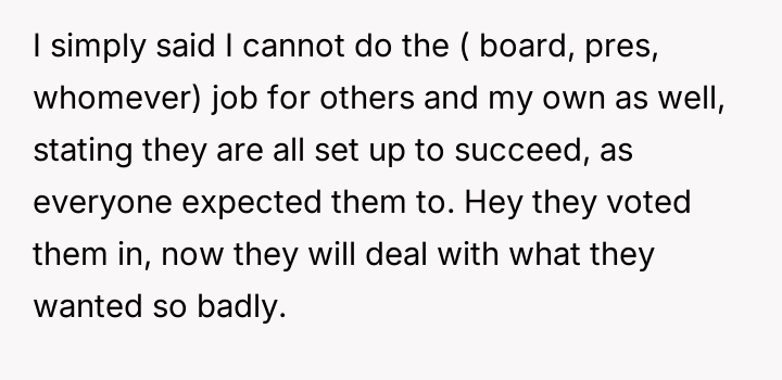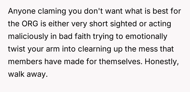 Is the OP justified in completely disengaging from all organizational leadership roles as a reaction to being undermined and then unfairly burdened with unofficial presidential responsibilities, or does this withdrawal represent an abandonment of their long-term commitment to the organization's s**bility?