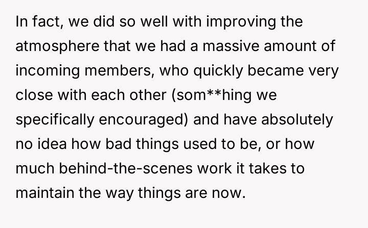 Her relentless effort, alongside a few others, transformed a struggling group into a thriving community, where new members flourished and bonds grew unbreakable — a testament to the unseen labor behind the scenes.