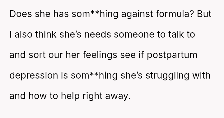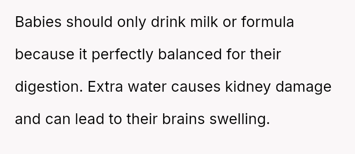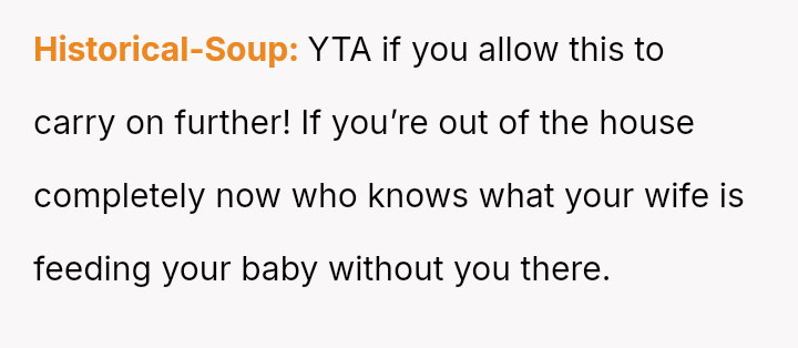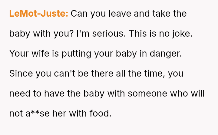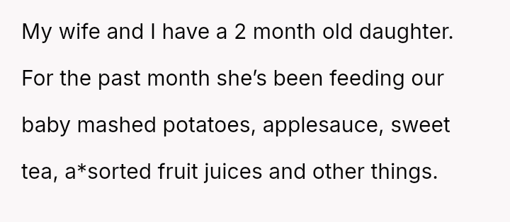 Despite medical advice to nourish their two-month-old with formula alone, his wife stubbornly insists on feeding her an array of inappropriate foods, convinced she knows better than the pediatrician.
