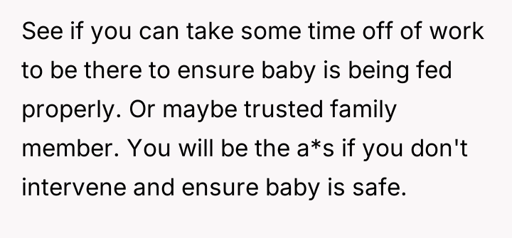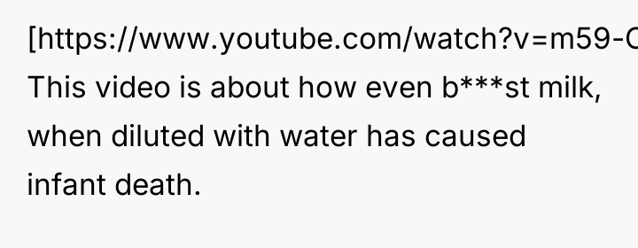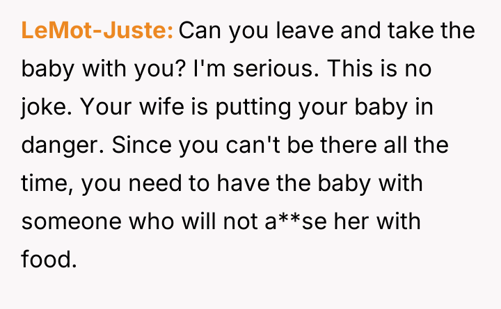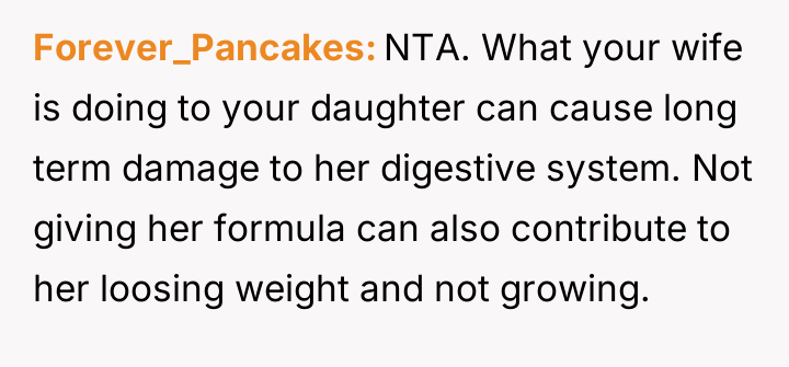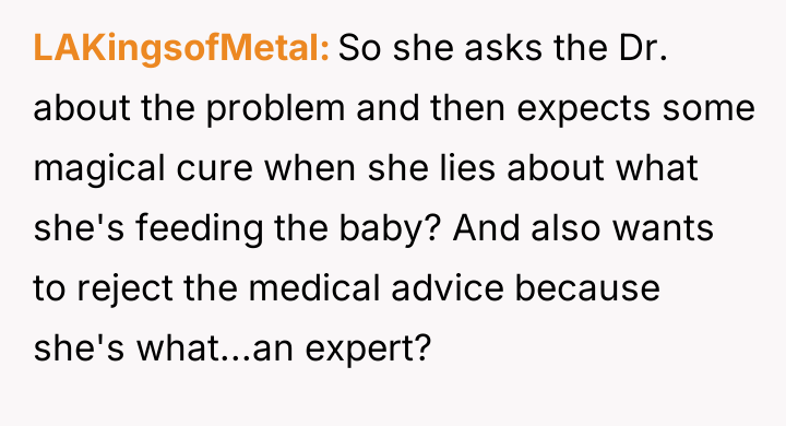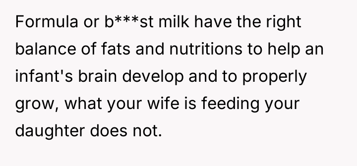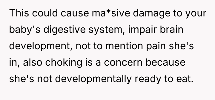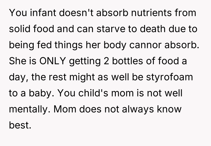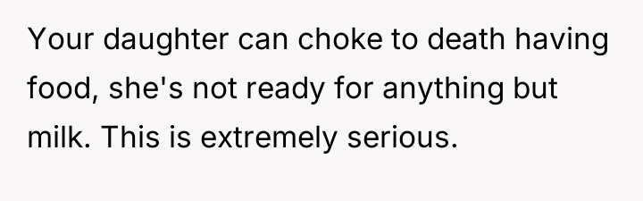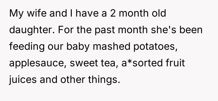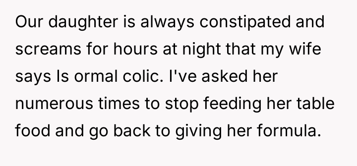 Despite medical advice to nourish their two-month-old with formula alone, his wife stubbornly insists on feeding her an array of inappropriate foods, convinced she knows better than the pediatrician.