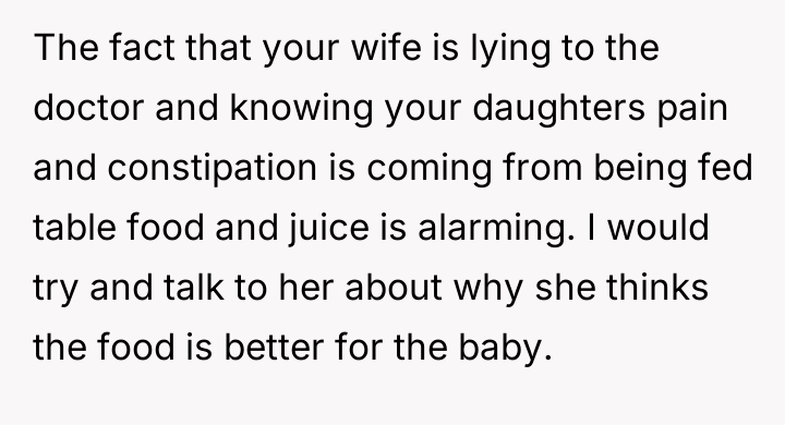 The original poster (OP) is facing a serious conflict stemming from his wife's decision to feed their two-month-old daughter solid foods and sugary liquids against medical advice, leading to the baby's physical discomfort and dishonesty during a medical consultation.