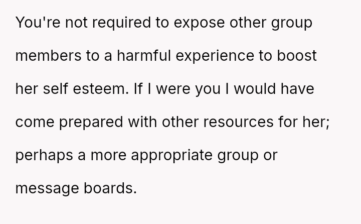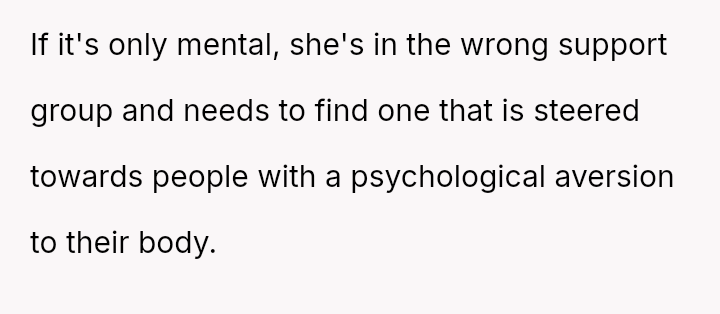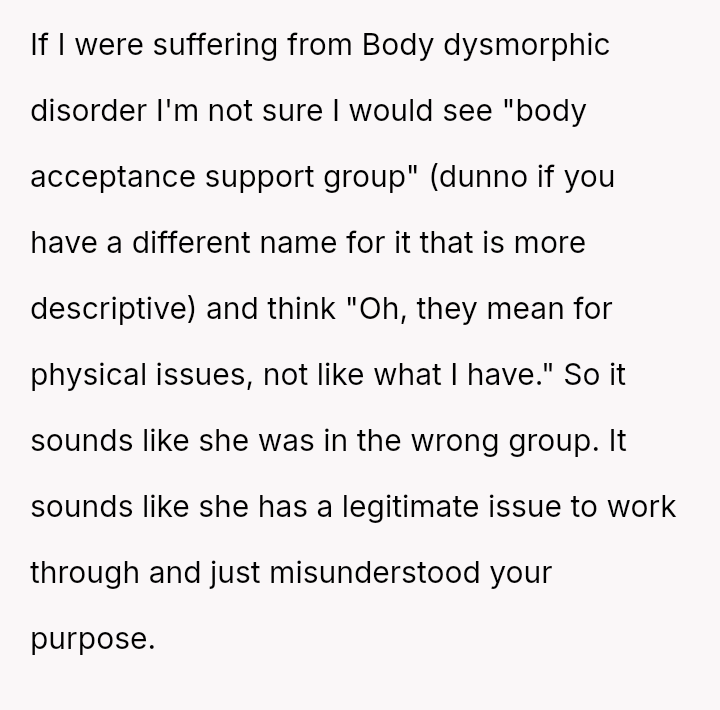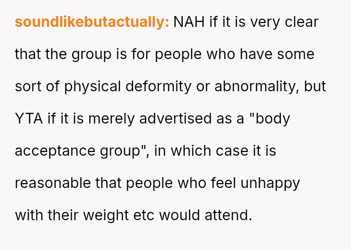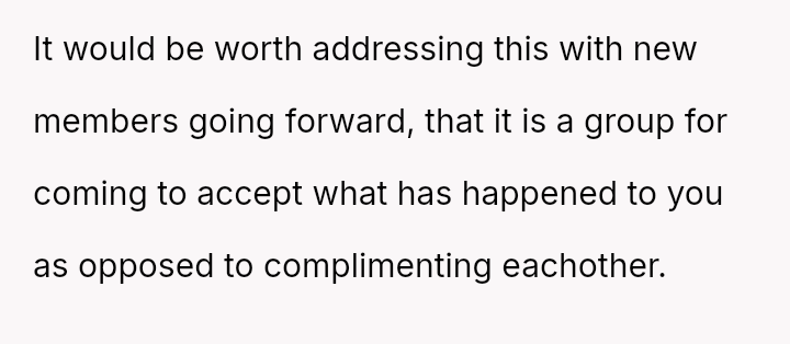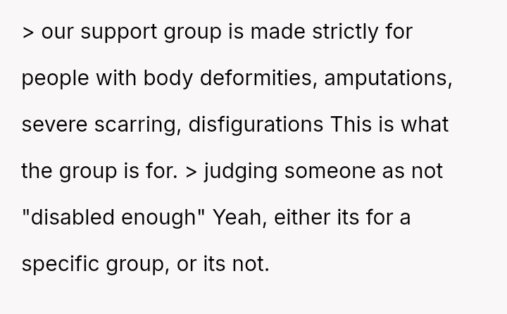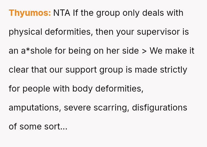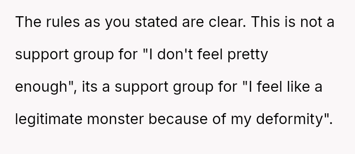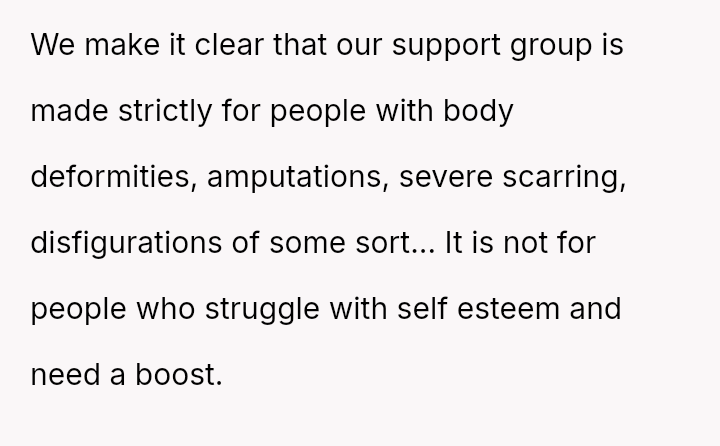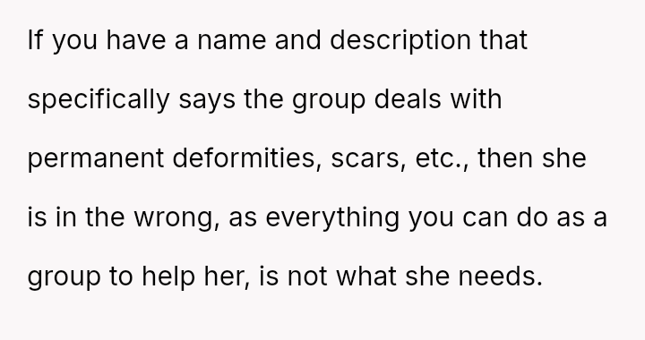 Was the OP justified in removing a member who refused to adhere to the stated criteria of a specialized support group, or did this action v***ate the core principle of offering unconditional support to anyone grieving or dealing with trauma related to their body?