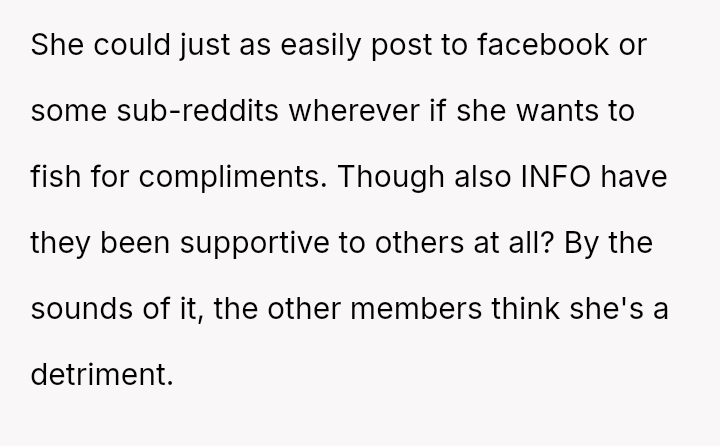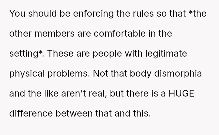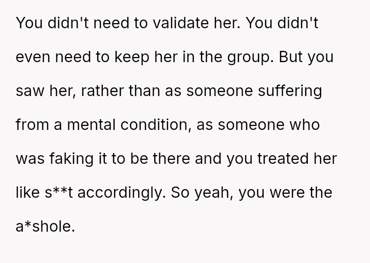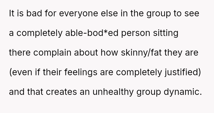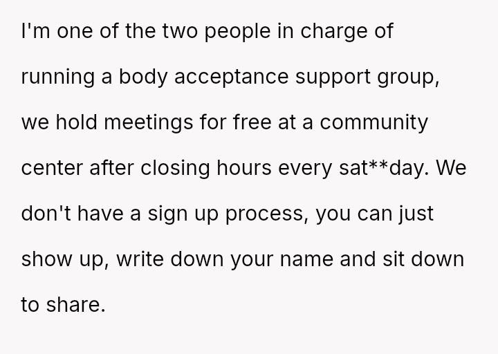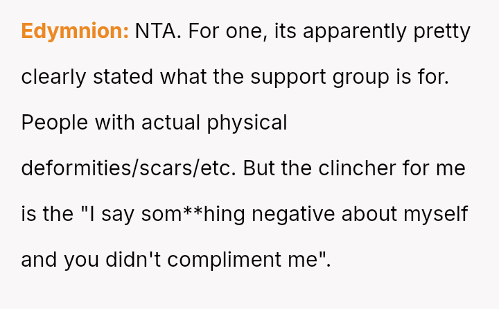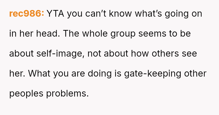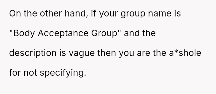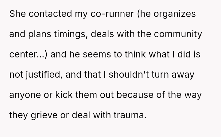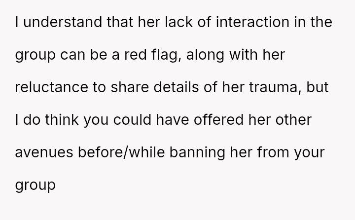 Was the OP justified in removing a member who refused to adhere to the stated criteria of a specialized support group, or did this action v***ate the core principle of offering unconditional support to anyone grieving or dealing with trauma related to their body?