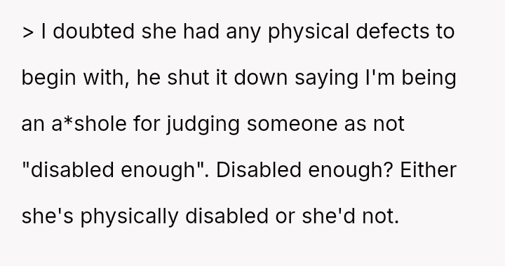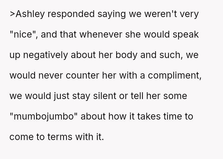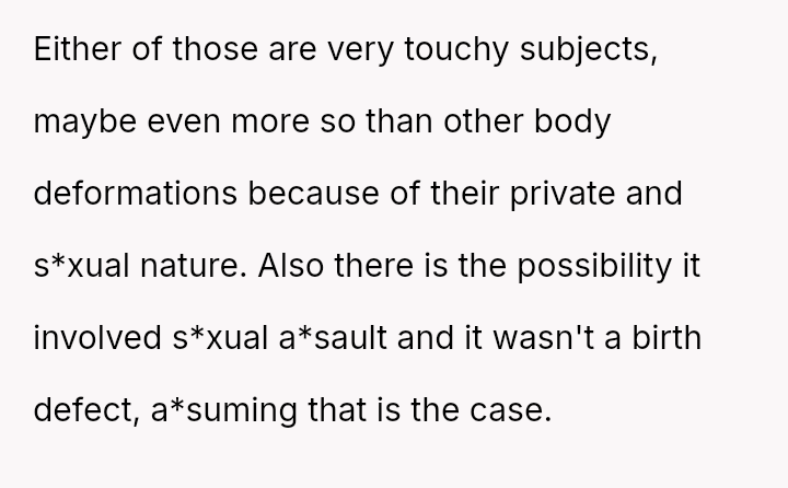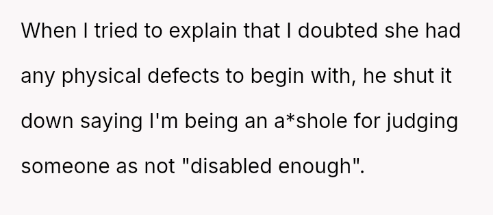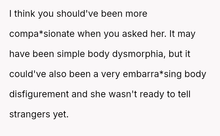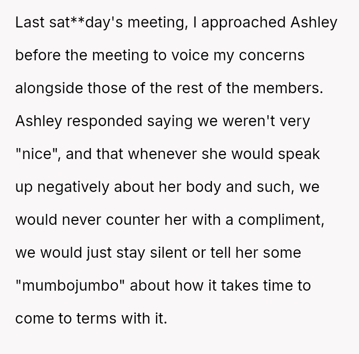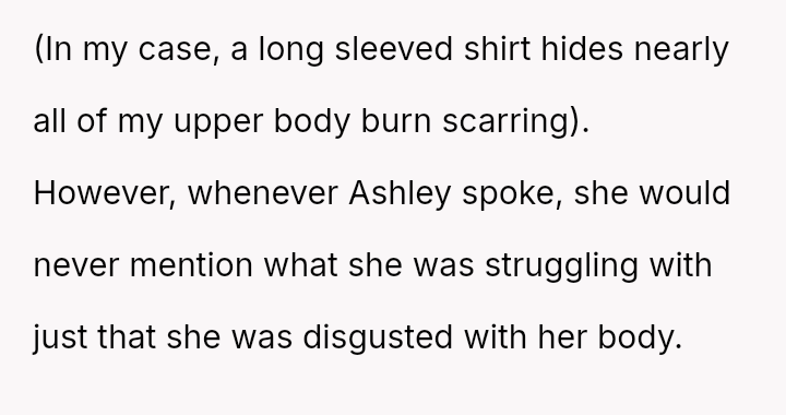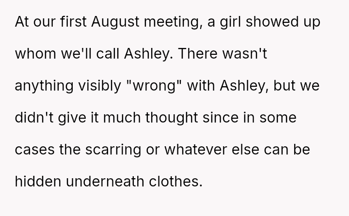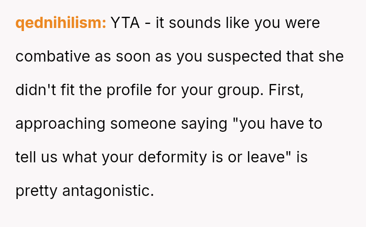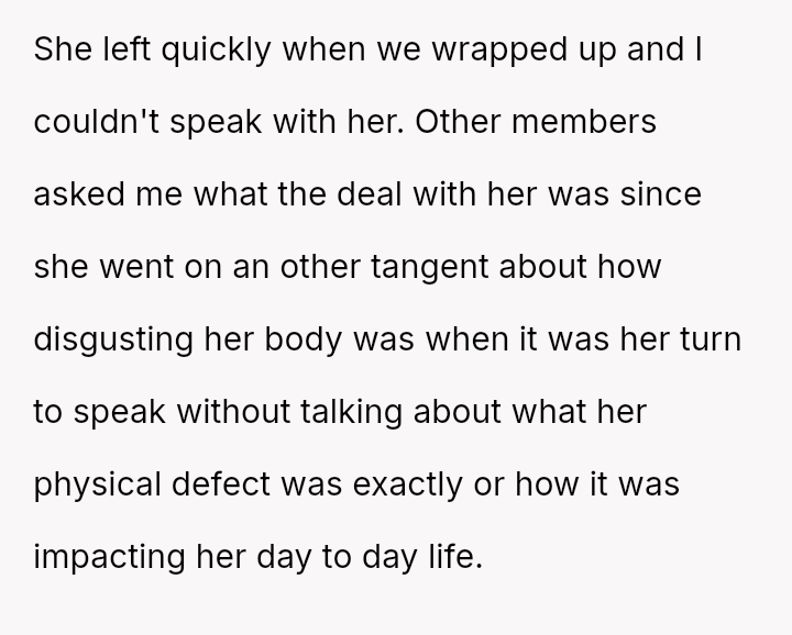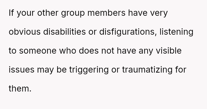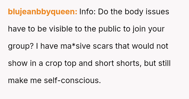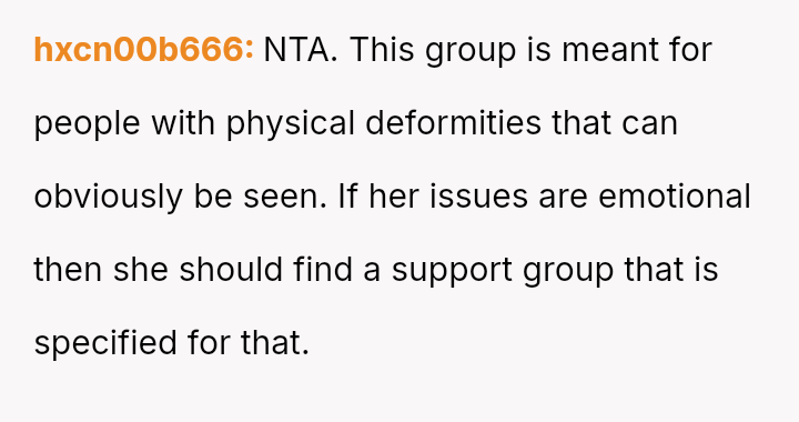 The original poster (OP) felt conflicted because the group's es**blished purpose—supporting individuals with visible or known physical deformities—was being challenged by a new member, Ashley, who refused to disclose her specific issue.